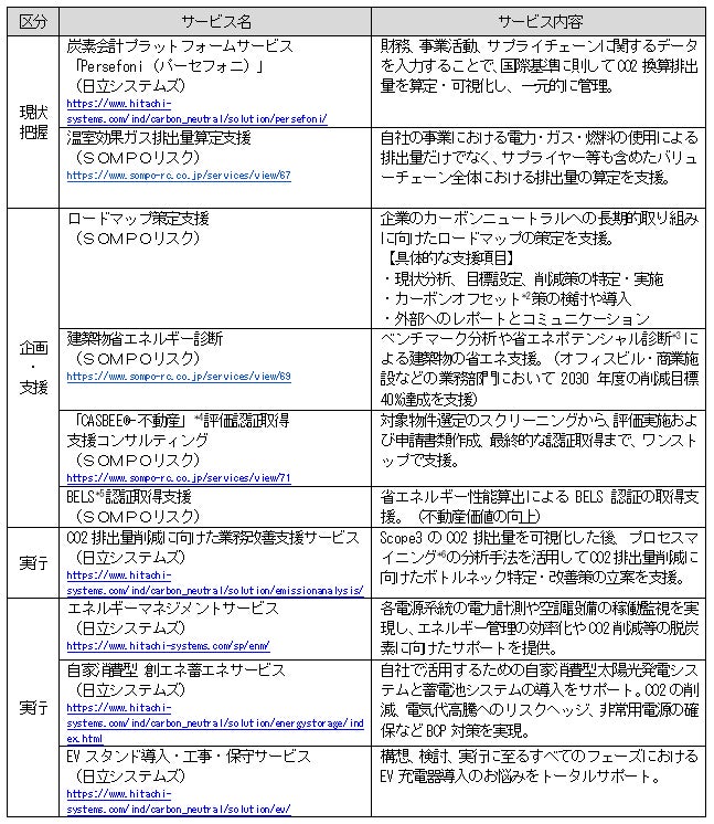 日立システムズは、温室効果ガスの排出量の可視化や削減に向けたソリューションを提供することにより、お客さまのカーボンニュートラルの達成を支援し、日立グループがめざす「生活の質の向上と持続可能な社会の両立の実現」に努めています。今回の業務提携により、従来から提供しているサービスに加えて、「企画・支援」の領域で、特に建築物の省エネルギーの対応に長けているSOMPOリスクのコンサルティングメニューを紹介することで、お客さまへのカーボンニュートラル推進を支援するサービスの提供領域を拡大することが可能となります。