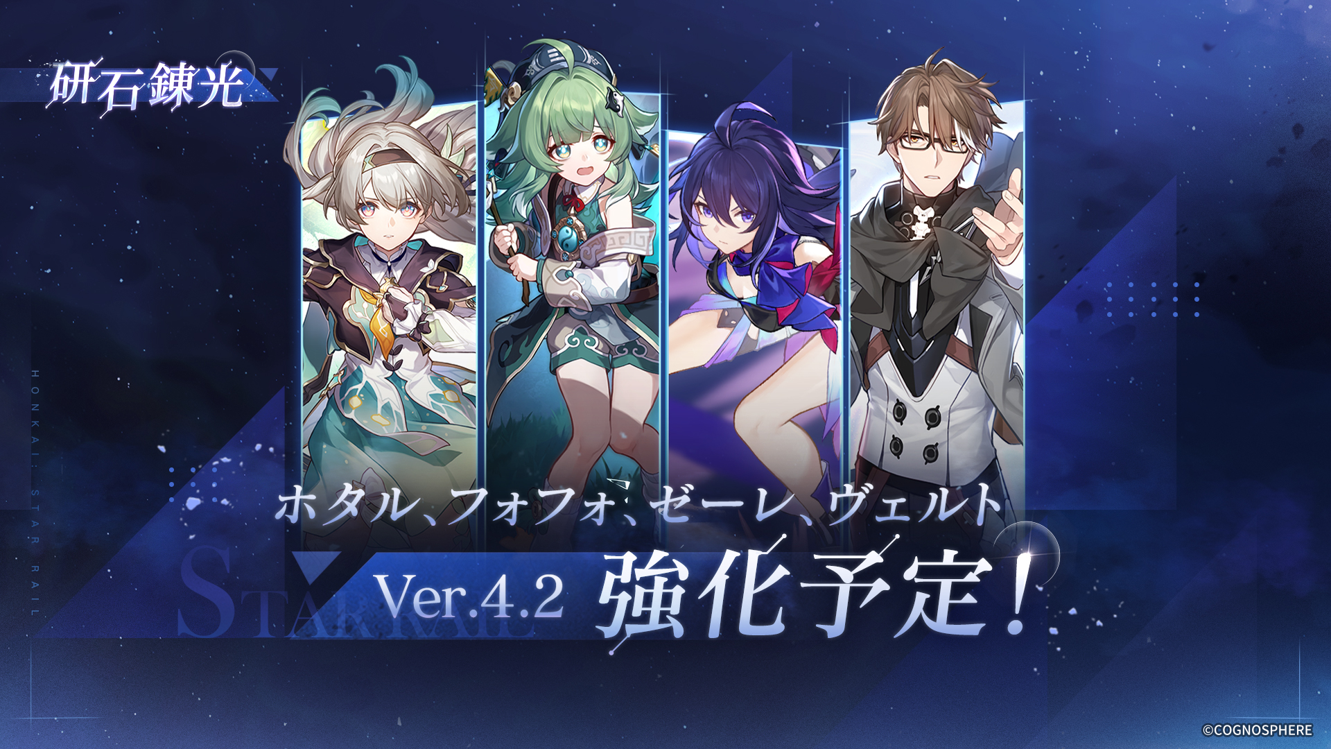 Ver.4.2では「ホタル」「フォフォ」「ゼーレ」「ヴェルト」の4キャラクターを強化!開拓者様、ぜひチェックしてみて下さい!