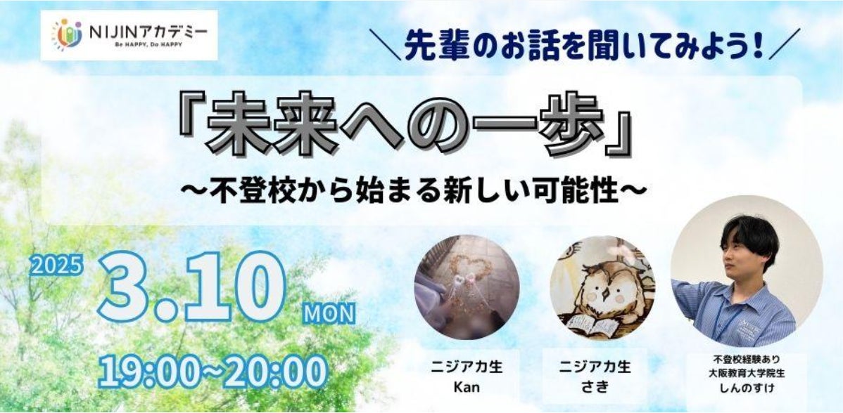 【3/10オンライン】不登校経験者が【進路】について語る「未来への一歩 ~不登校から始まる新しい可能性~」―オルタナティブスクールNIJINアカデミー主催