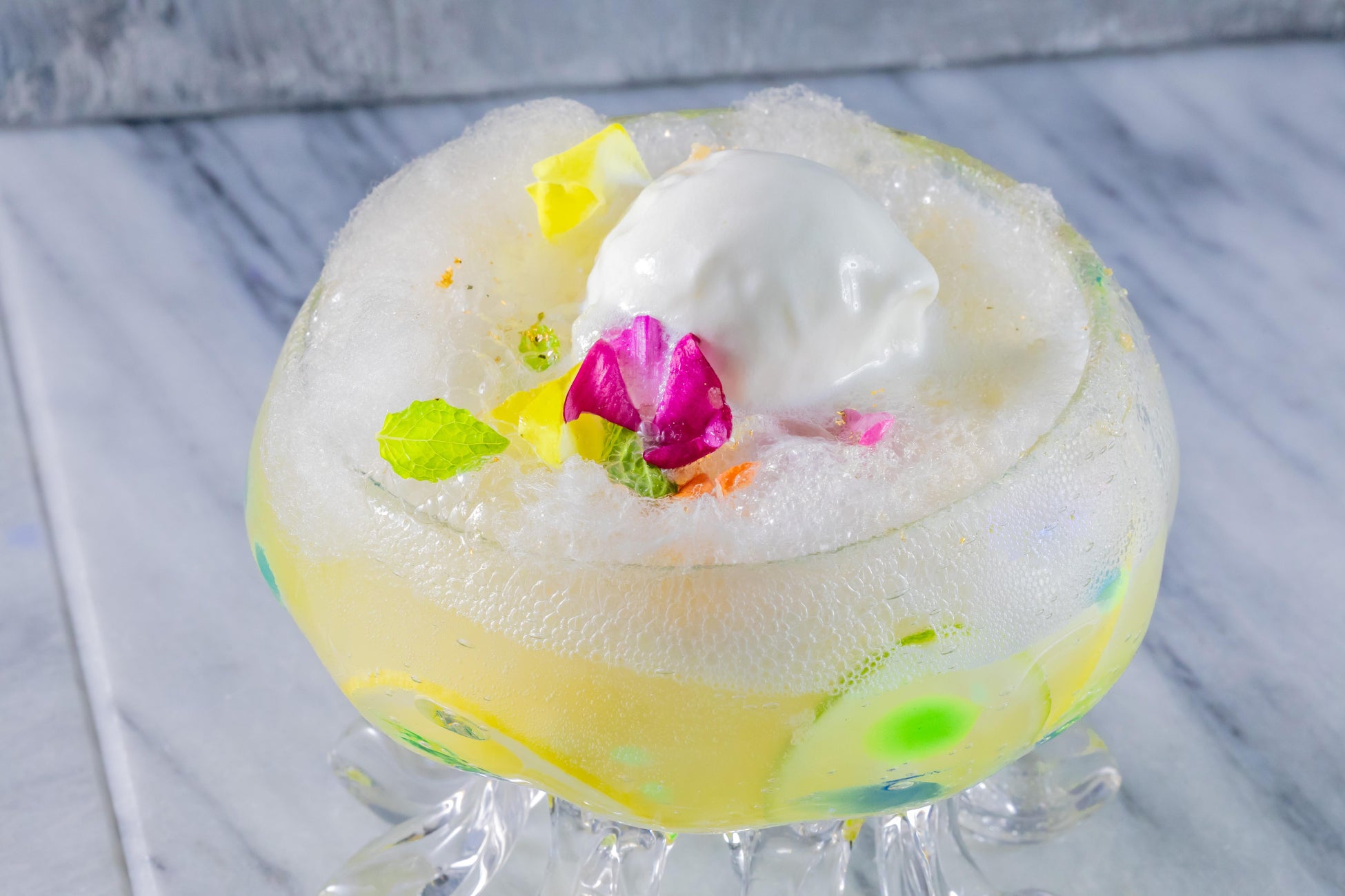 季節に合わせたスイーツをお届けするKIHARU Brasserieから、昨年人気を集めた“綿菓子が消える”変化系かき氷がパワーアップして登場。愛らしいクラゲ型グラスに、メロンシャーベットやレモンアイスゼリーを重ね、エルダーフラワーや金粉をあしらった存在感ある綿菓子をふんわりと被せました。そこに、冷え冷えのどこか懐かしいラムネを注ぐと、中に仕込まれたパチパチキャンディーが弾けながら綿菓子がほどけながら溶け、中からまるっとしたアイスクリームが顔を出します。シャリっとした食感のメロンシャーベットと凍ったナタデココ、さっぱりとしたレモンゼリーの爽快感が口いっぱいに広がり、最後には、綿菓子とラムネ、アイスクリームが絶妙に混ざり合って、まろやかなメロンクリームソーダへと変化します。メロンとレモンの爽やかさに、クリームソーダの優しい甘さが重なった、クセになるご褒美デザートを、KIHARUの涼しい店内でぜひご堪能ください。