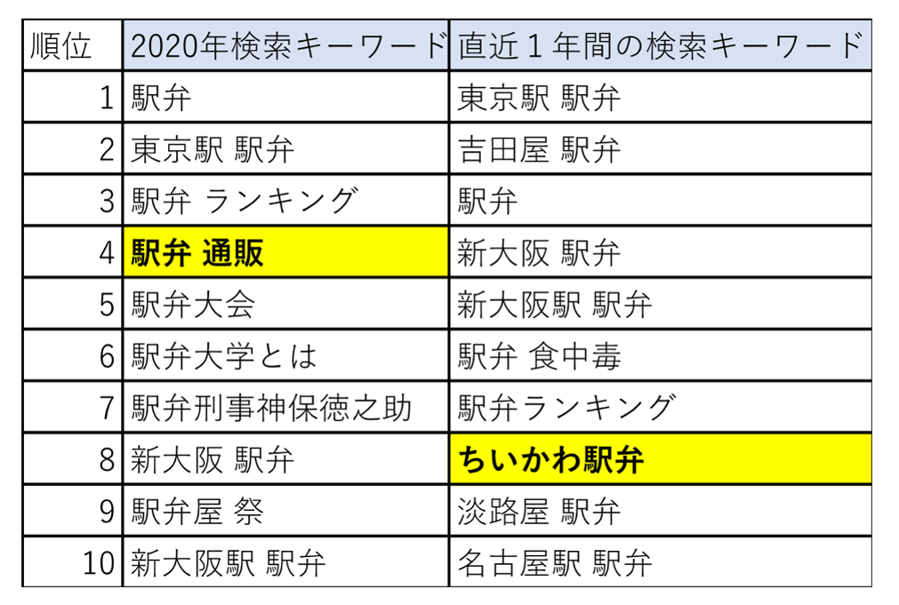 ■直近1年間の検索キーワードランキングで「ちいかわ駅弁」が8位にランクイン。コロナ禍の駅弁ニーズは「通販」