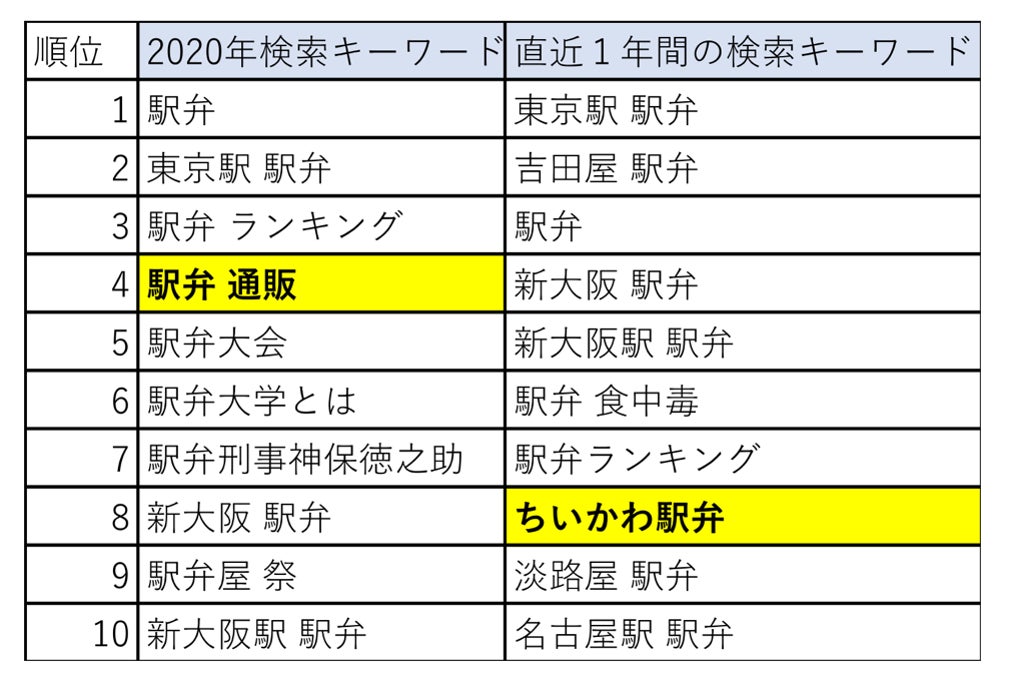 一方、2020年の検索キーワードの4位には「駅弁 通販」がランクインしました。コロナ禍の外出が制限された状況下で「自宅でも旅気分を味わいたい」というニーズがあったことが推察できます。