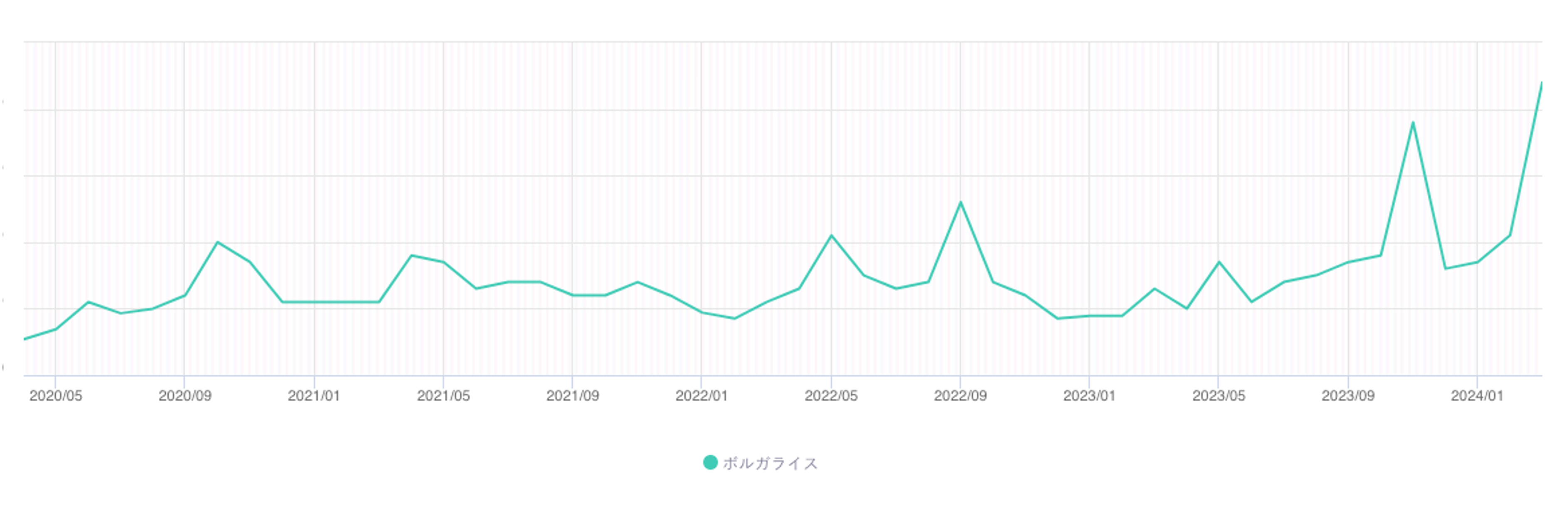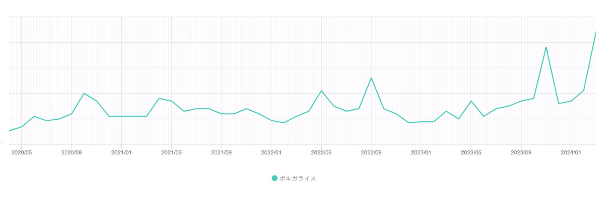 検索・人流データをもとに人々の興味・関心を分析できる「ヤフー・データソリューション」のデスクリサーチツール「DS.INSIGHT」で分析したところ、福井県のご当地グルメ「ボルガライス」の検索量が昨年9月ごろより増加傾向にあることがわかりました。年末で一度収束するも、直近の2024年2月では1年前と比較して2倍以上の検索がされており、徐々に注目を集めていることがわかります。