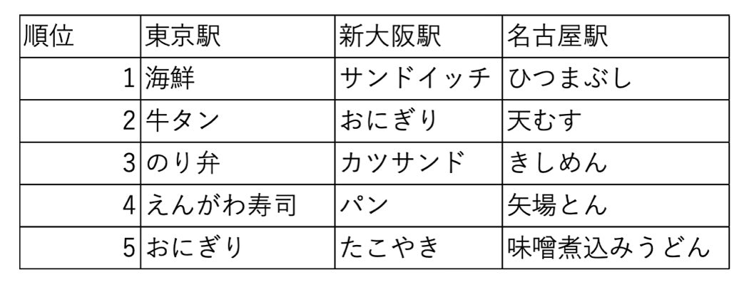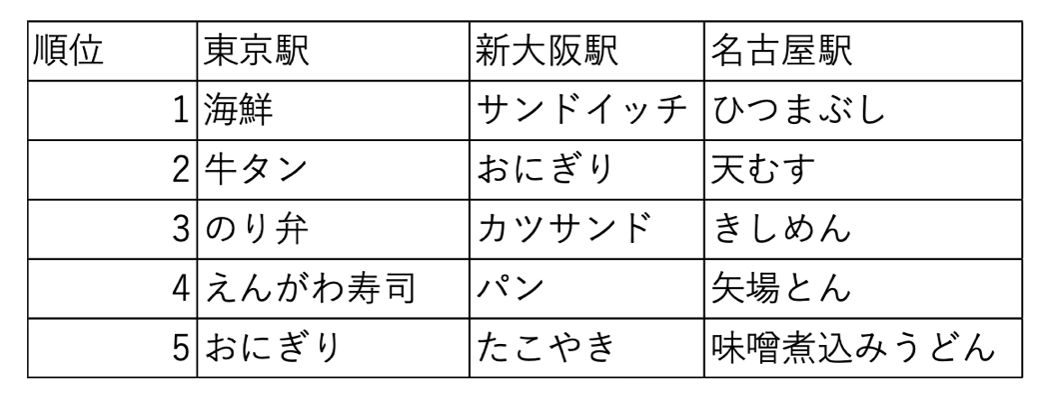 ■東京駅で求められているグルメは「海鮮」「牛タン」「のり弁」、名古屋はご当地名物、新大阪は軽食か