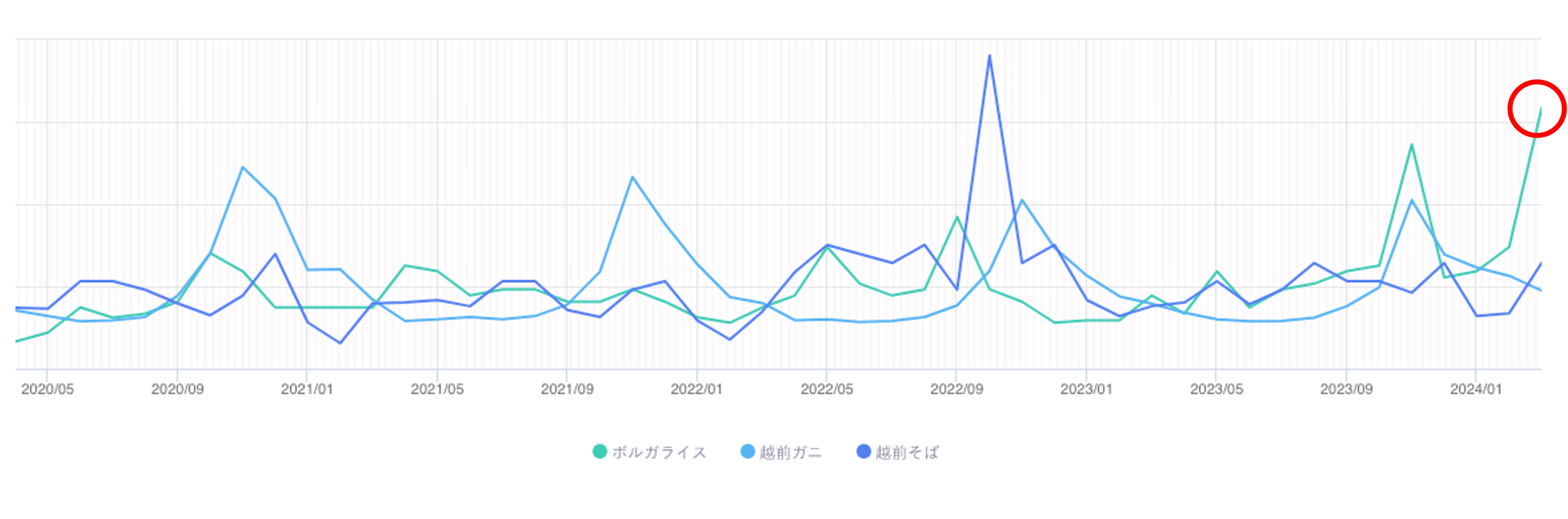 福井県を代表するご当地グルメ「越前ガニ」「越前そば」と「ボルガライス」の検索推移を比較しても、その伸びを見て取ることができ、今後も注目が続けば福井県=「ボルガライス」としてより確立したブランドに繋がることも考えられます。