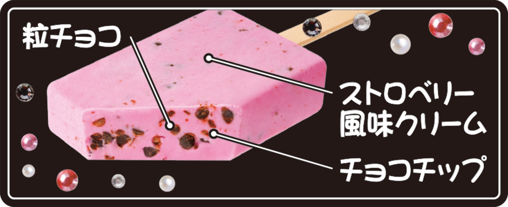ストロベリー風味のアイスに粒チョコとチョコチップを入れたから、ゴリゴリ・パリパリ食感が味わえて、ガチでバイブスアガる⤴⤴チョコとストロベリーの味わいがグッドになるようにバランス良く作ったよん☆スティックはゥ于からのチョベリグメッセージ付きで、全部で6種類あるよ( *´艸`)パッケージデザインのヒョウ柄はキラキラしてきゃわたんだから絶対に実物見てNE!!!