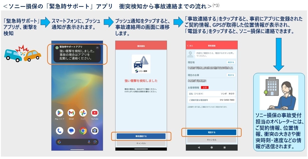 これにより、ご契約のお車が、他物との衝突などにより強い衝撃を受けたことを「緊急時サポート」アプリが検知したときは、スマートフォンに表示されるプッシュ通知をタップすることで、ソニー損保に事故のご連絡と事故受付に必要な情報の伝達ができるようになりました(*1)。