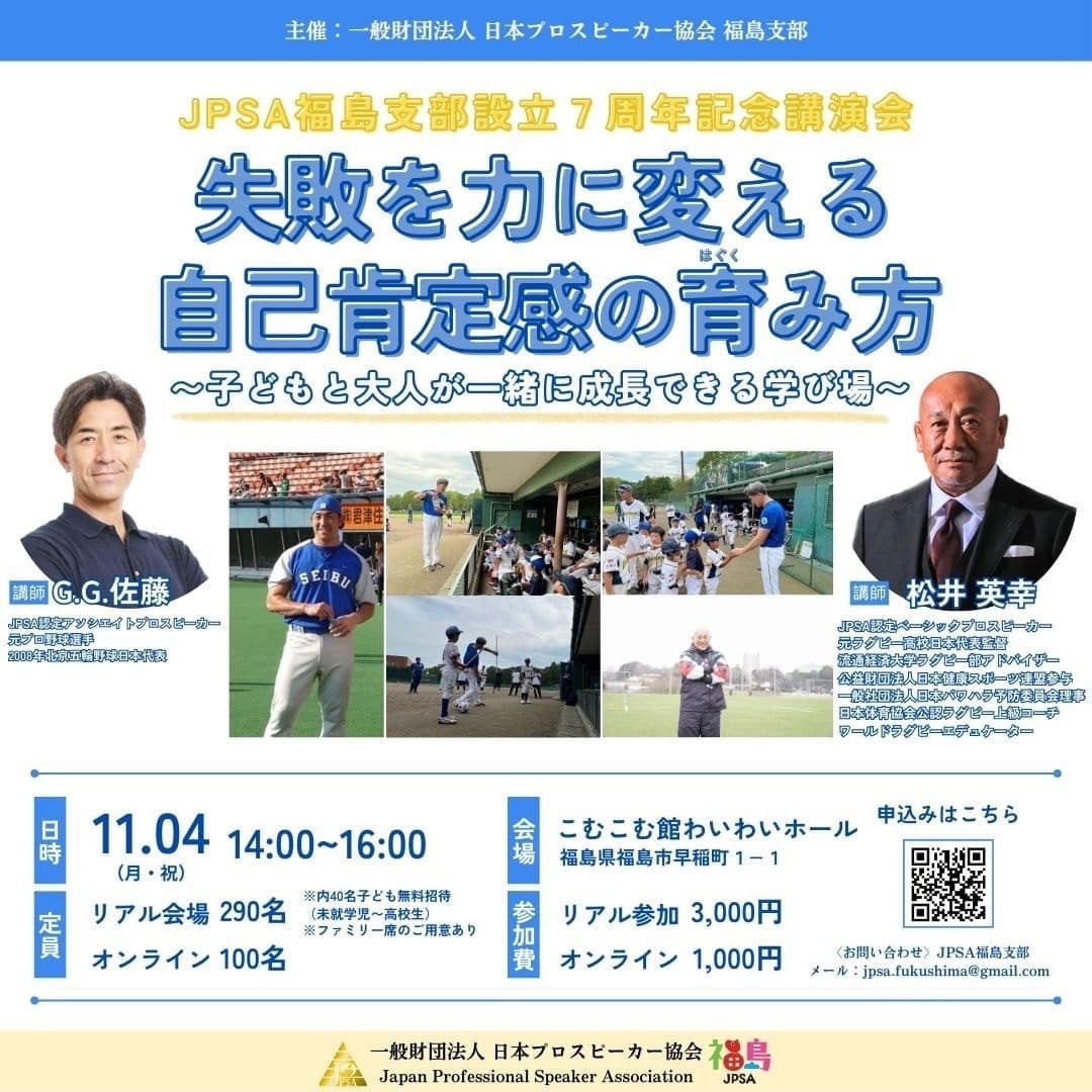 一般財団法人 日本プロスピーカー協会(以下、「JPSA」)の福島支部が11月4日(月)にリアルとオンラインのハイブリッド形式にて、支部設立7周年を記念した講演会を開催いたします。講師として登壇するのは、2008年北京五輪野球日本代表で元プロ野球選手のG.G.佐藤氏、元ラグビー高校日本代表監督の松井英幸氏です。お二人から失敗を力に変える自己肯定感の育み方をテーマにお話いただきます。