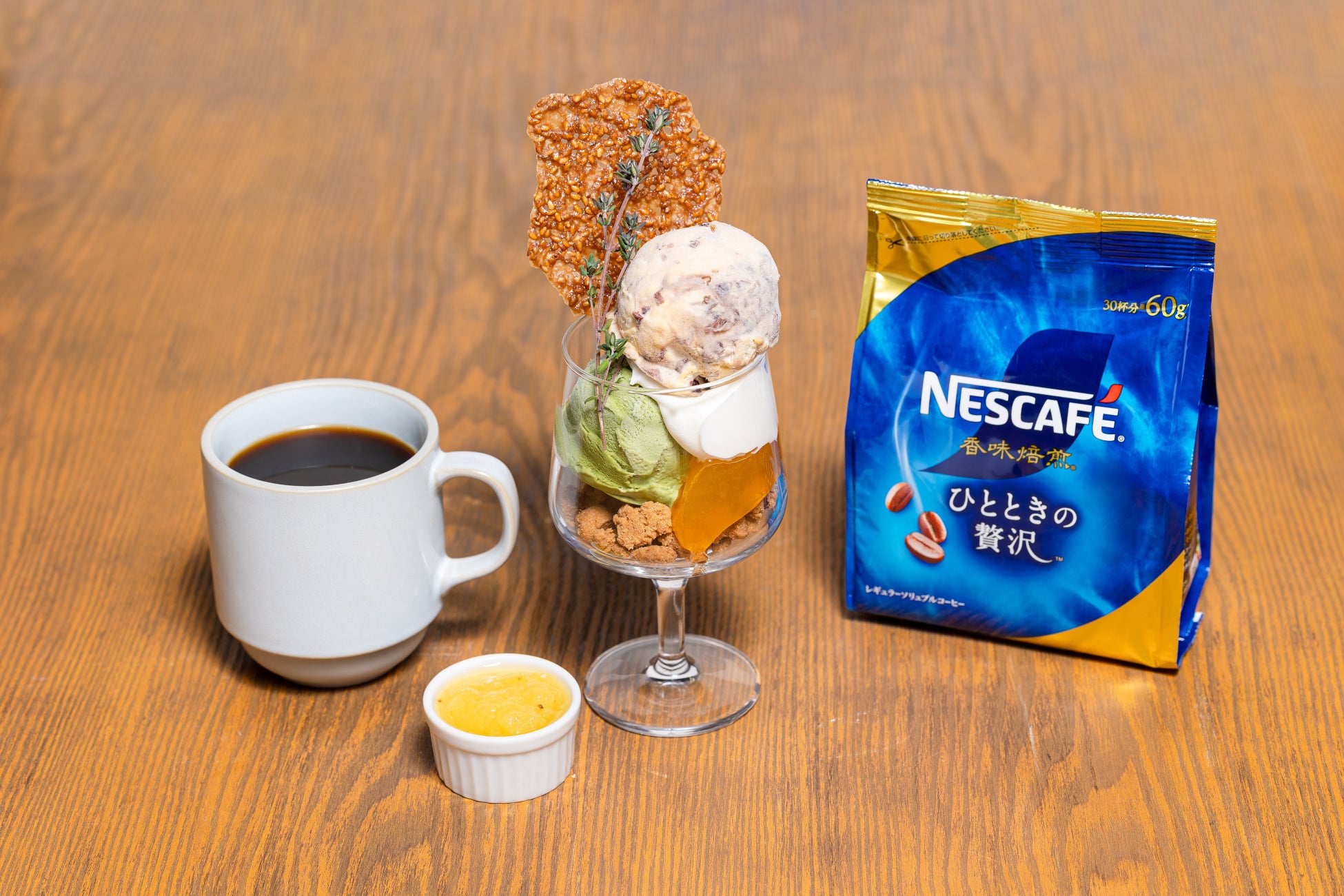 特長:抹茶アイスやきなこのシュトロイゼルなどがのった和素材のサンデー。パイナップルソースをかけて味変も楽しめる。「ネスカフェ 香味焙煎 ひとときの贅沢」と一緒に楽しむことで、コーヒーのフルーティな味わいと、華やかな香りがより引き立つ。