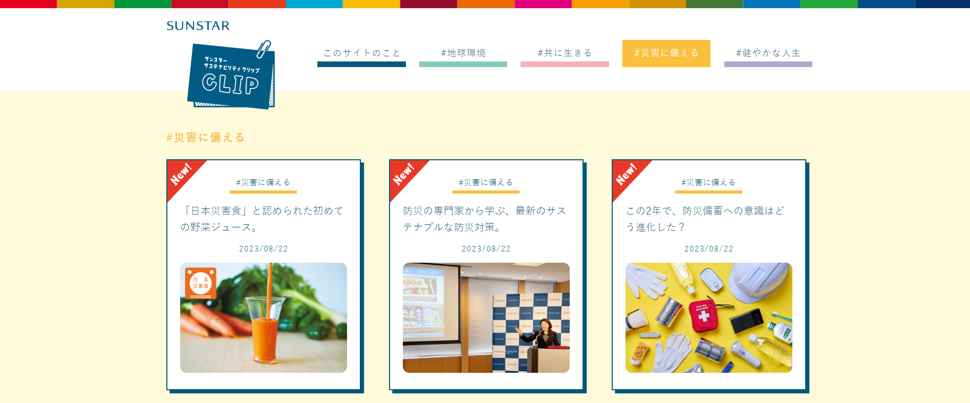 環境対応の取り組みを紹介する「地球環境」、誰もが笑顔になれる社会づくりを目指した「共に生きる」、災害時に健康を守るための「災害に備える」、人生100年時代の口腔の健康維持と全身の健康を考える「健やかな人生」の4つのテーマに沿って、サンスターの活動をタイムリーに紹介するウェブサイトです。https://jp.sunstar.com/s-clip/