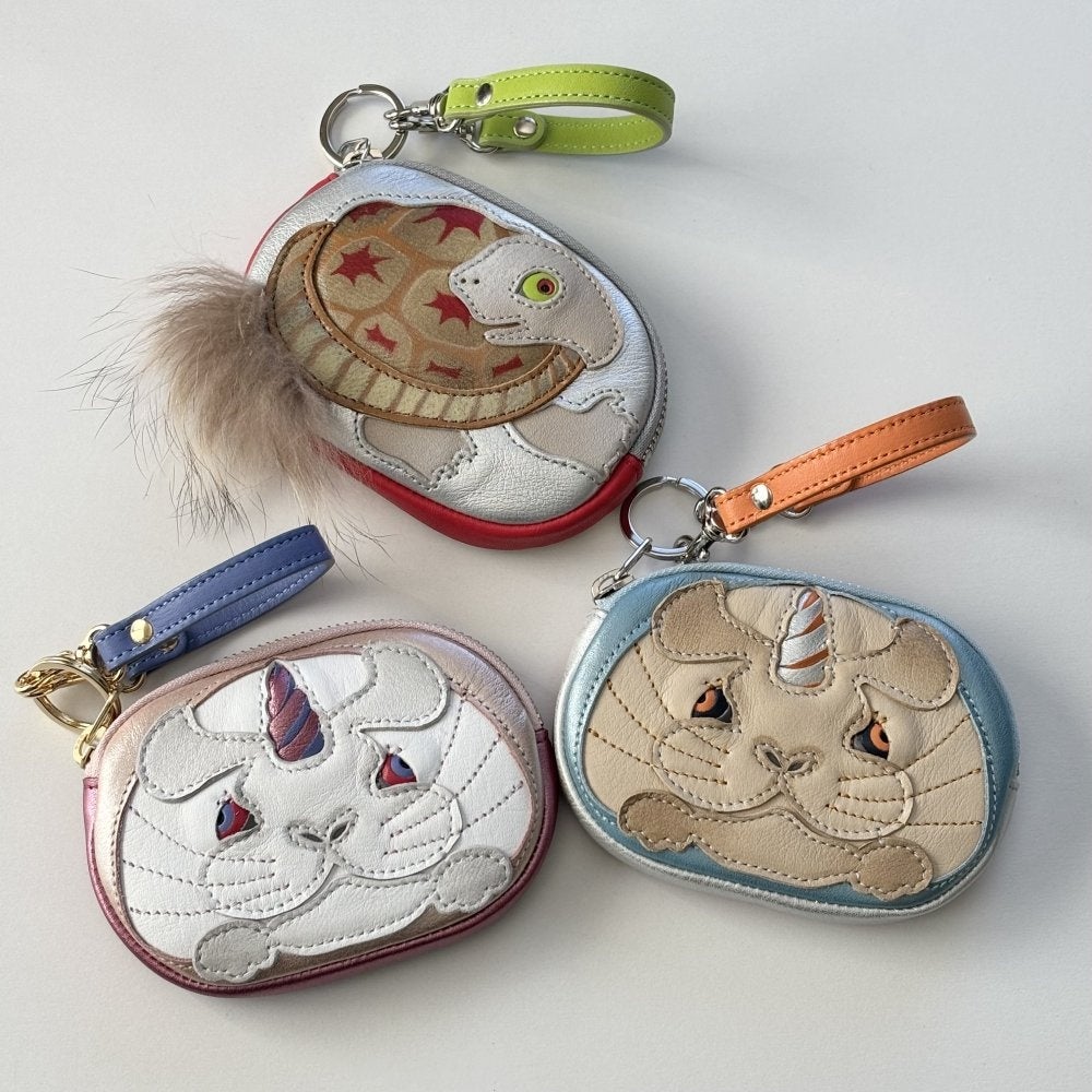 日本の牛革を使用した丸いお財布“マメポ®”を販売。極めて傷みにくく、磁気を通すためパスケースとしての使用も可能なマメポには、持ち手コードも付属。表面には和モチーフ・妖怪・動物など、少し癖のあるデザインが施された、機能性もデザイン性も高いお財布です。