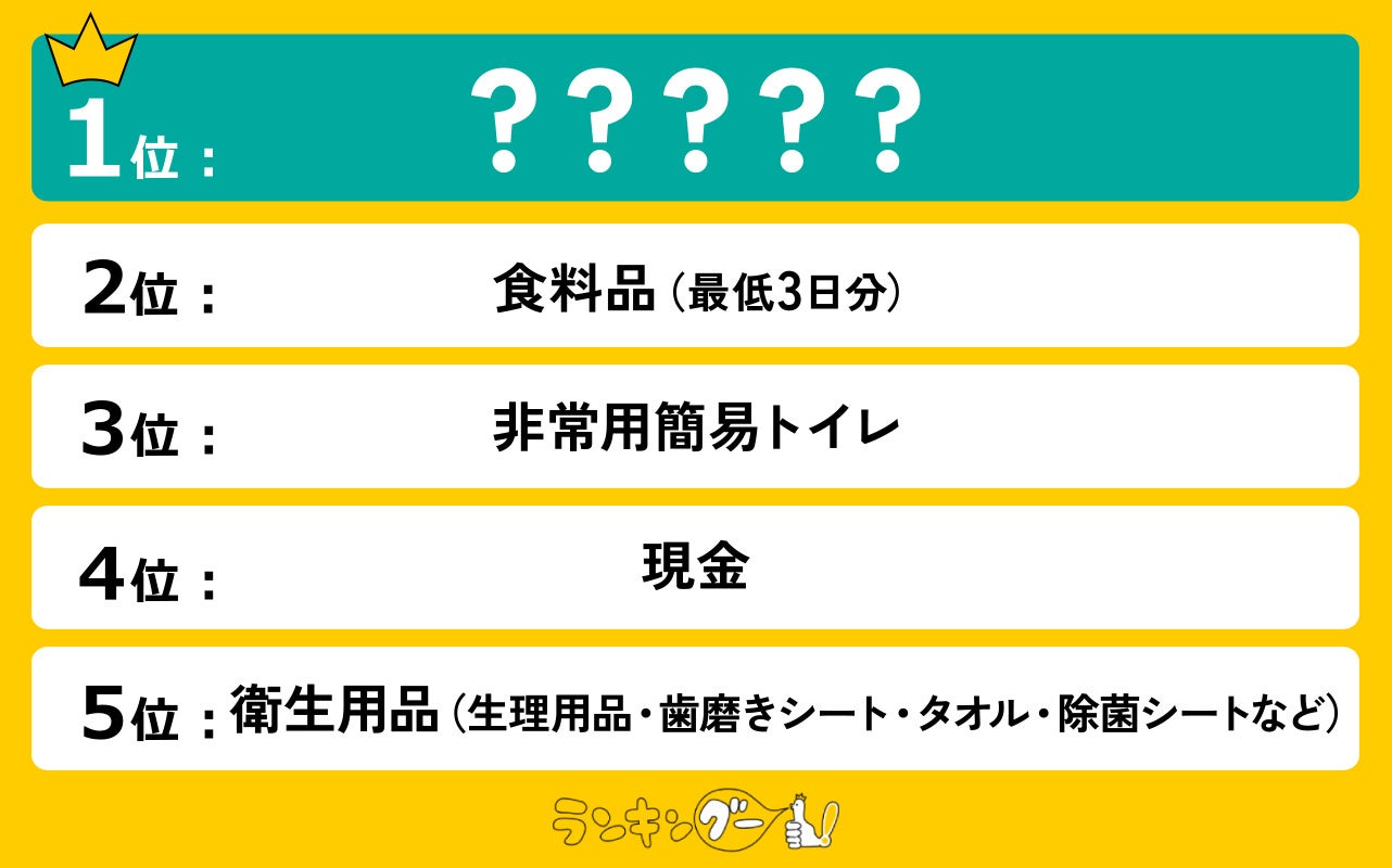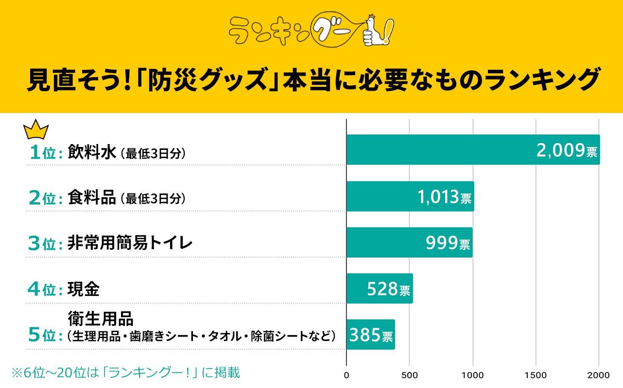 1位は2,009票を獲得した、最低3日分は確保しておきたい飲料水に決定!2位は食料品。3位は非常用簡易トイレ。4位は現金。そして、5位は生理用品や歯磨きシートなどの衛生用品がランクインしました!