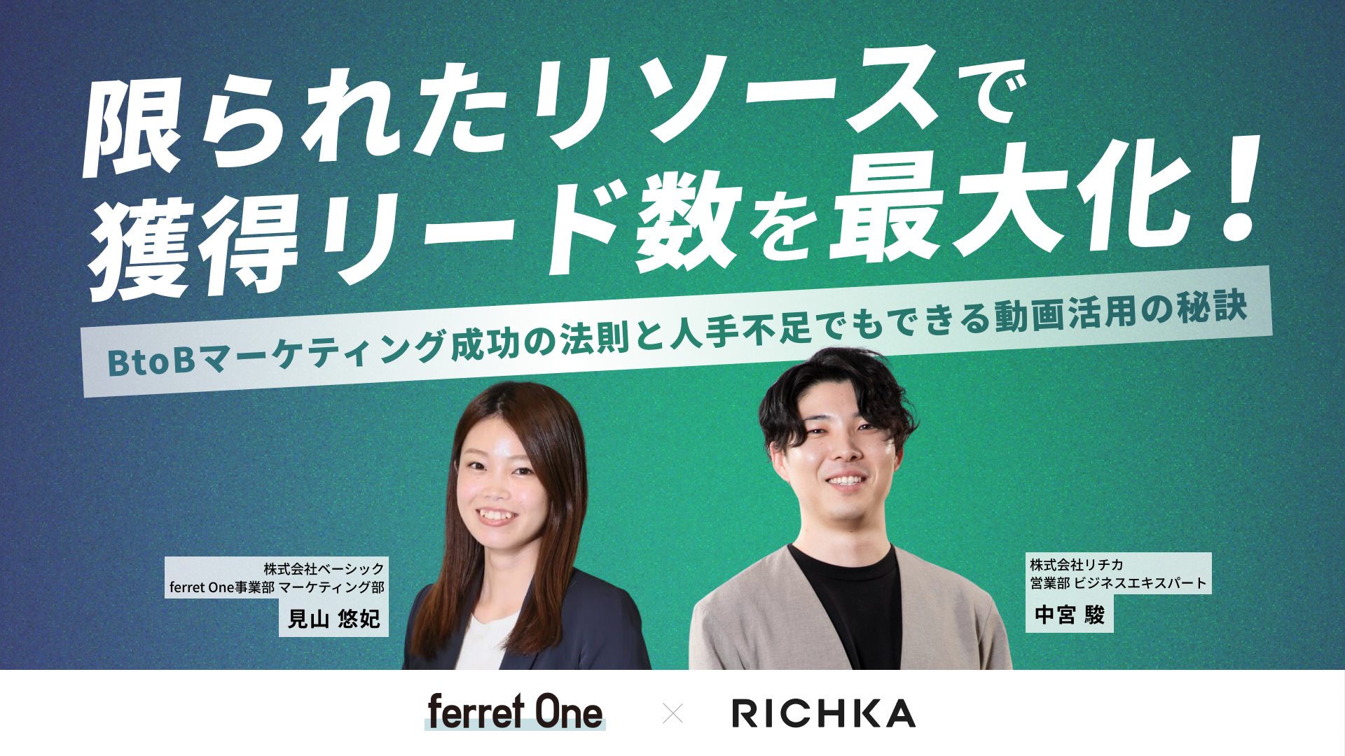 本セミナーでは、限られたリソースの中でリード獲得効率を最大化するべく、BtoBマーケティング領域のプロである『ferret One』においてマーケティングを担当する当社の見山が「施策運用の定石」について、リチカ社でビジネススペシャリストである中宮氏が「人手不足でも実践可能な動画運用の方程式」について、解説いたします。