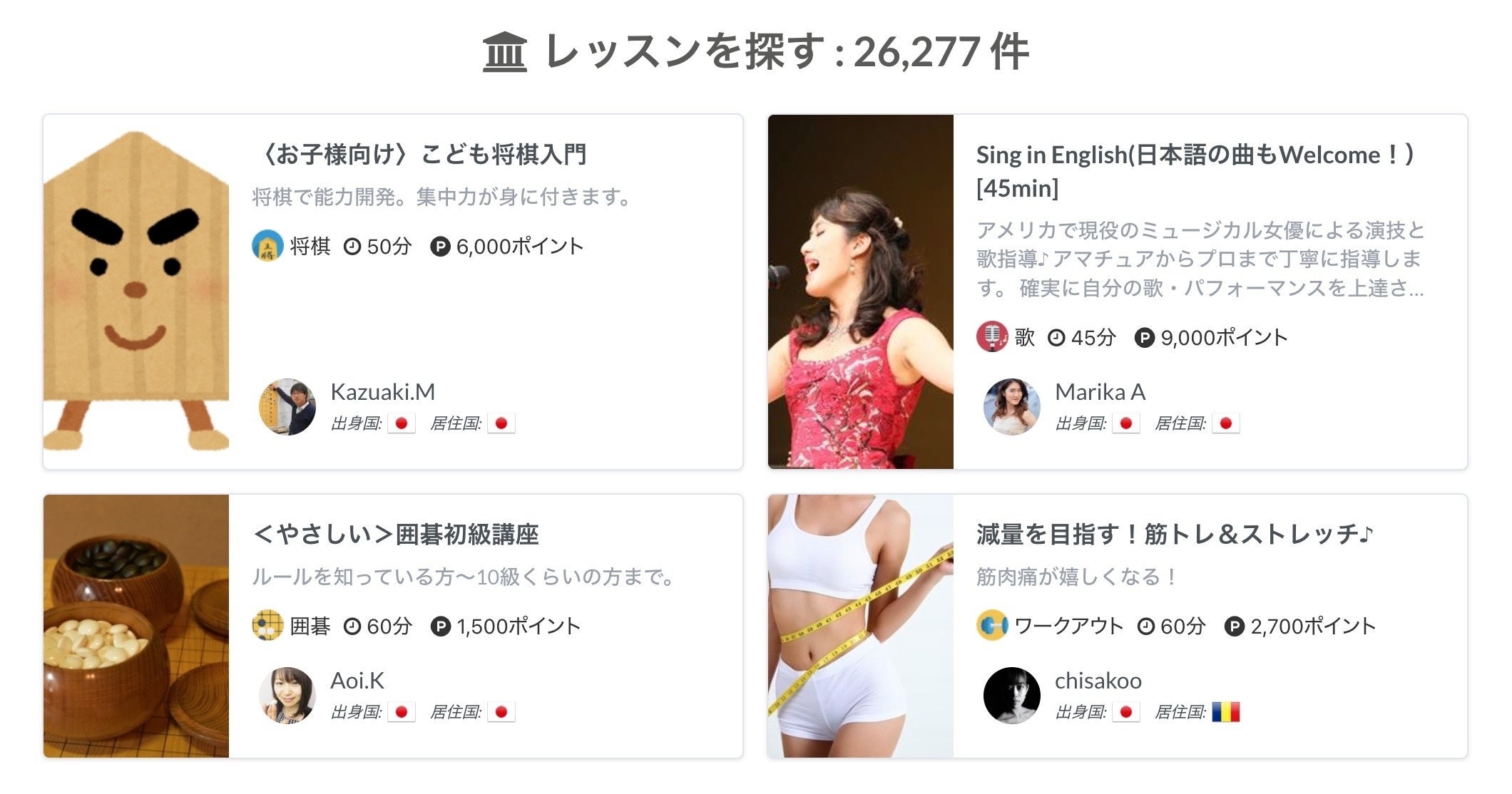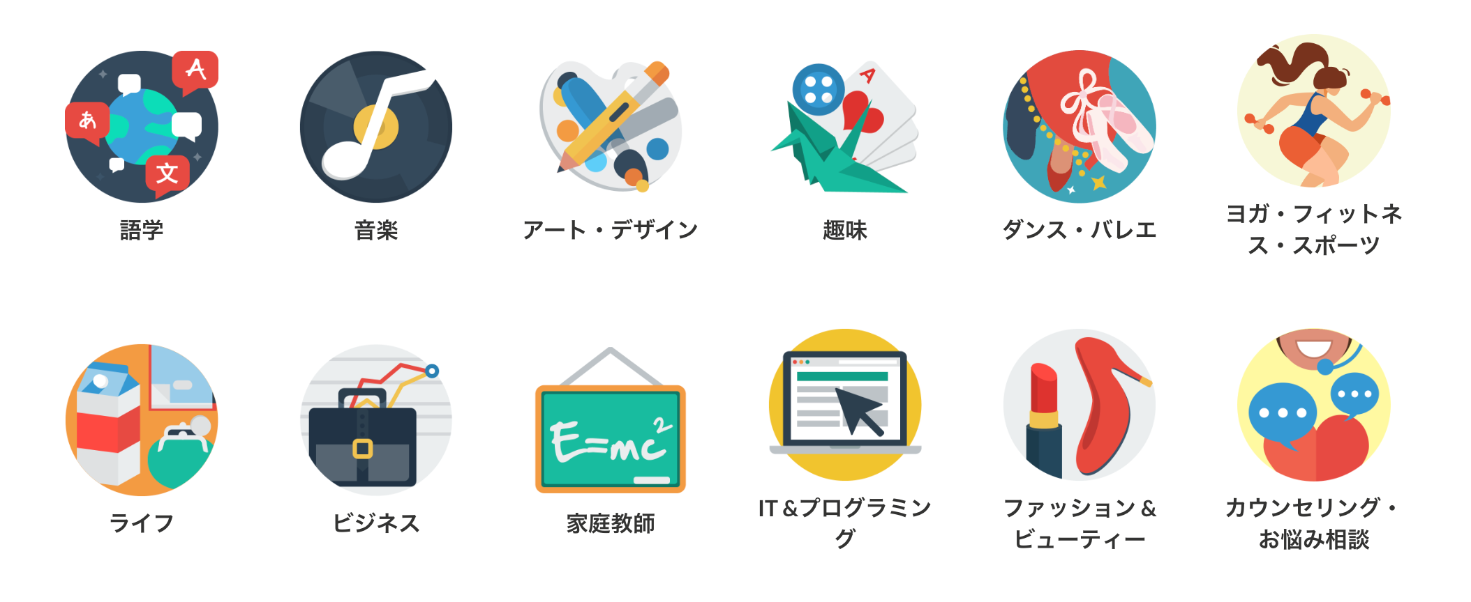 語学のみならず、音楽、フィットネス、ダンス、自分磨き、家庭教師レッスンなど豊富なバラエティあるカテゴリーのオンラインレッスンが揃っています。