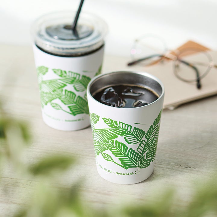 紅型の芭蕉柄と飛行機がコラボした、BLANC JUJU×ソラシドエアのオリジナルデザインのタンブラー。真空二重構造で保冷・保温効果も抜群!直接ドリンクを注いでも、コンビニカップを入れてもOKの2WAY仕様。水滴も気になりません。