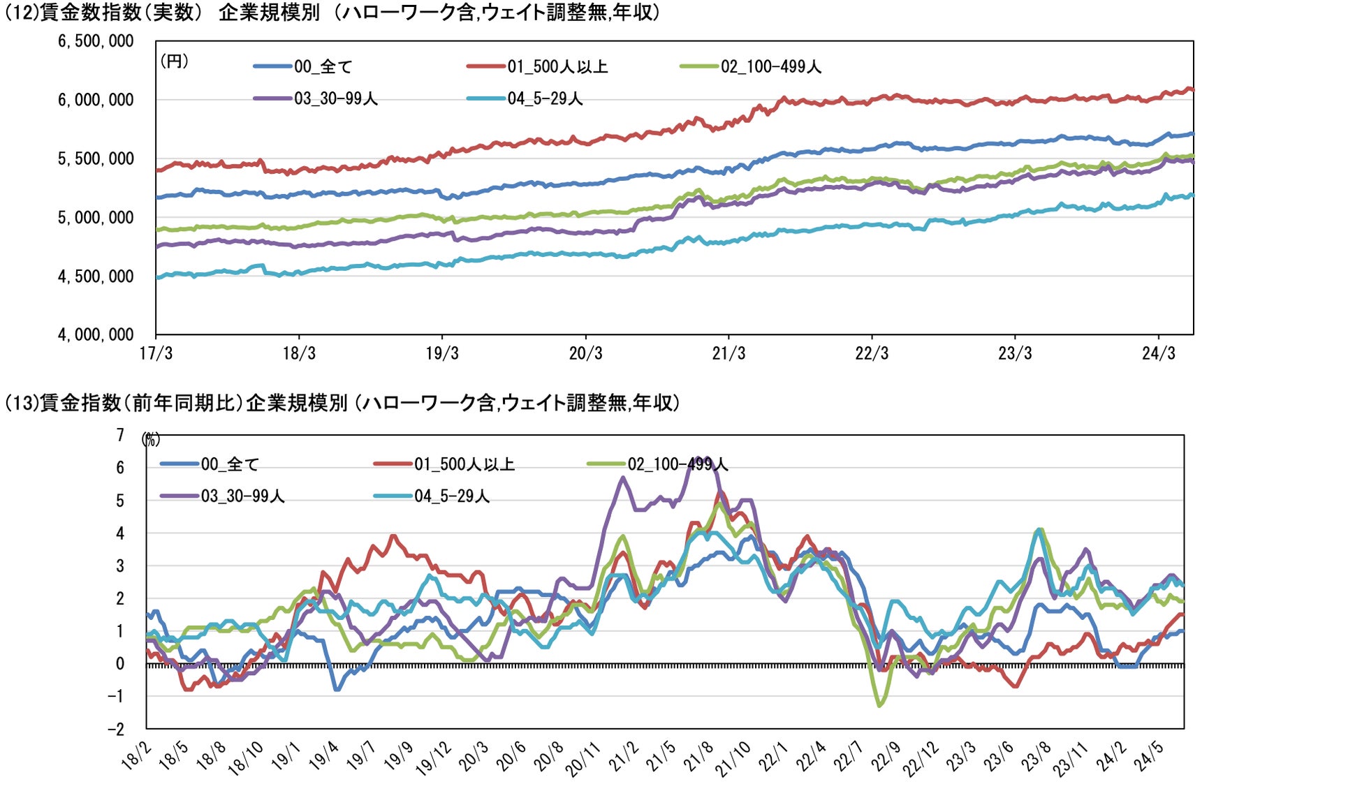 ・金額としては500人以上の企業で6/24週の年収が608万円で最高、5-29人の企業が519万円で最低で、2024年初頭と比べると差が縮まっている。
