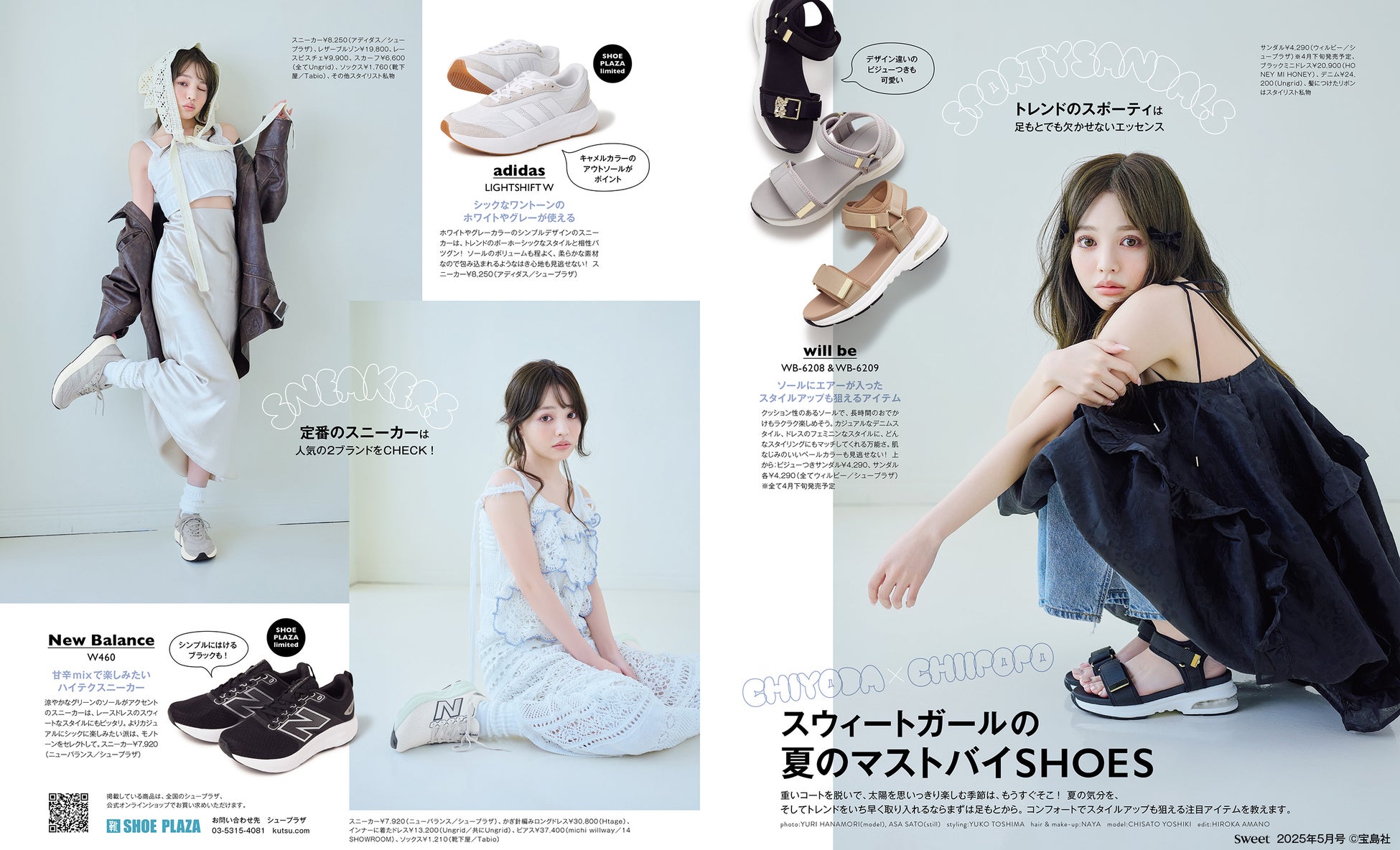 第2弾となる、4月12日発売の「sweet」では、モデルのちいぽぽさんが「will be」のサンダルと「adidas」「new balance」のスニーカーをかわいく履きこなしてくれました。