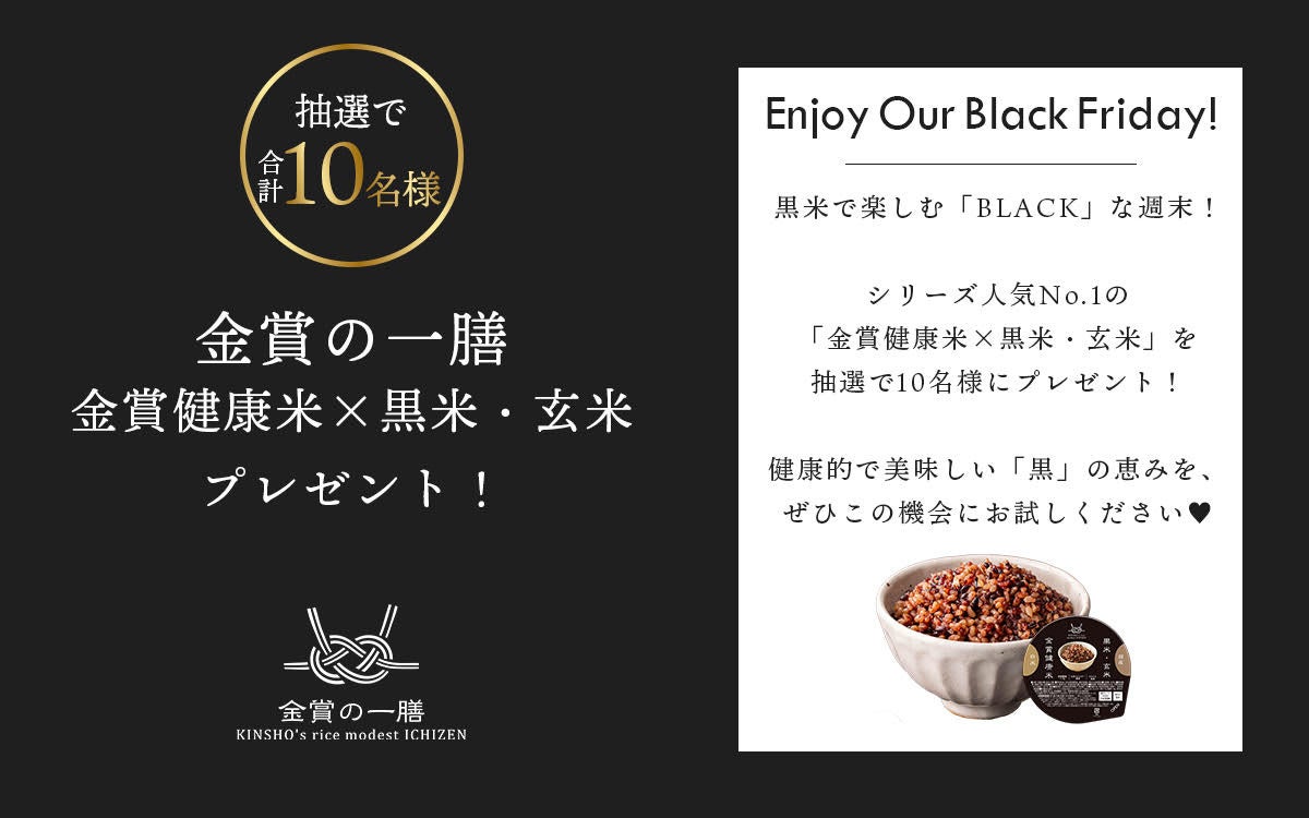 『金賞の一膳』のブラックフライデーキャンペーンは、ブラック(黒)にちなんで、一番人気の『黒米・玄米』5パックを、抽選で10枚様にプレゼントいたします。