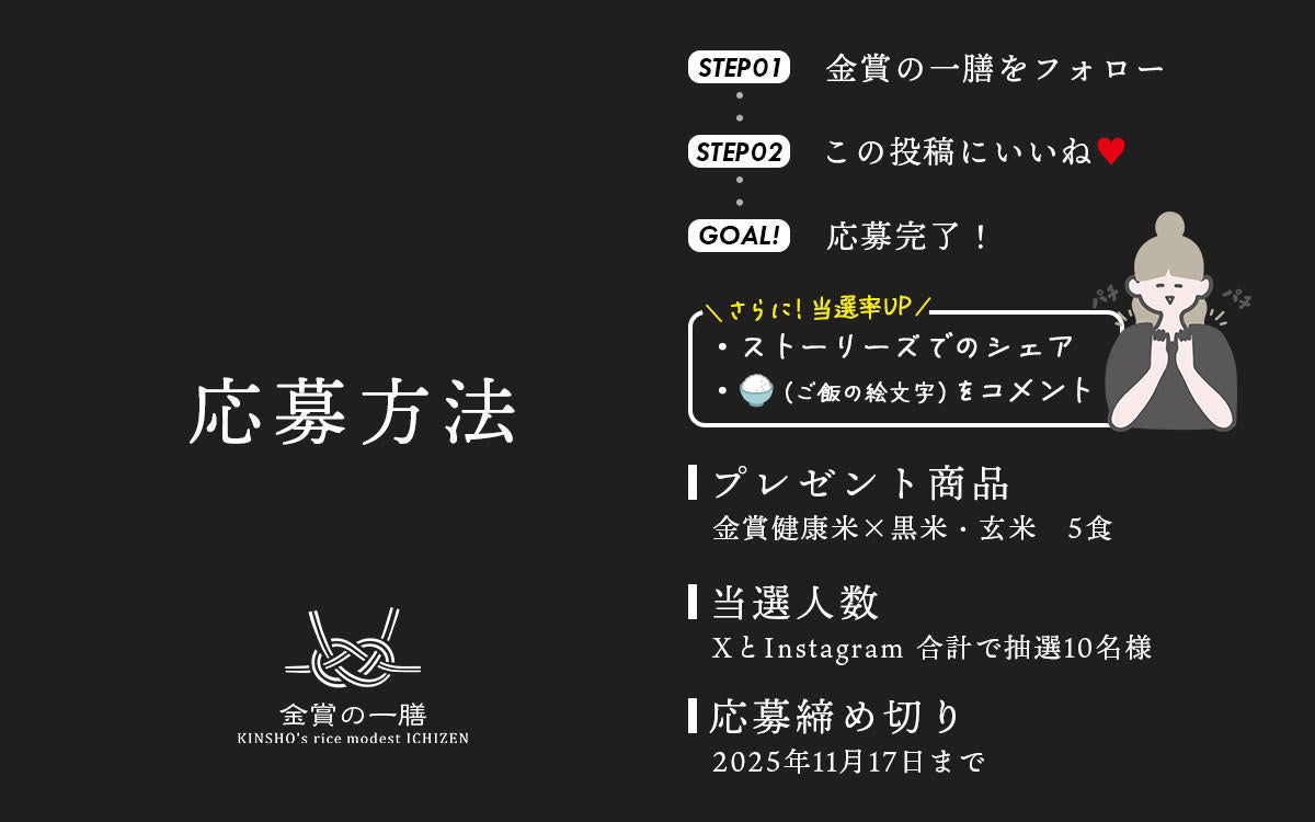 ①金賞の一膳公式Xアカウントをフォロー ②プレゼントキャンペーン投稿をリポスト ③「🍚(ごはんの絵文字)」をコメントすると当選確率アップ |