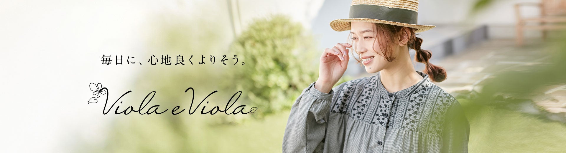 Viola(スミレ)の花言葉は、「小さな幸せ」。Viola e Violaは、“日常の小さな幸せと笑顔がたくさん重なるように”という想いを大切にしています。トレンドを追いかけるよりも、自分の気に入ったものを着てあなたらしく過ごせるように、暮らしに寄り添うブランドです。