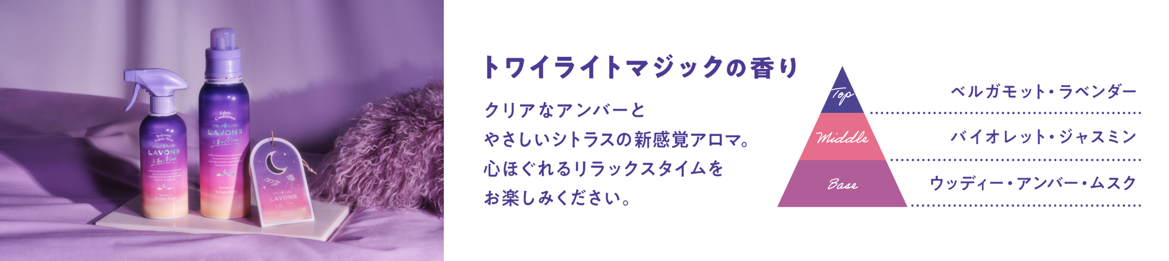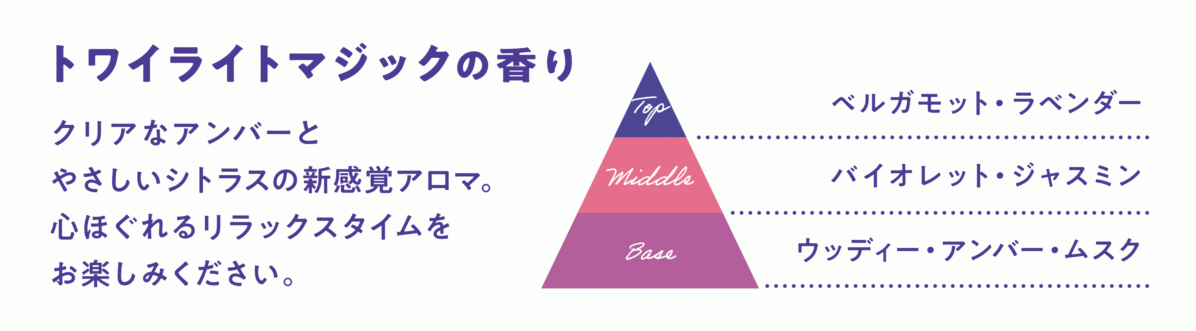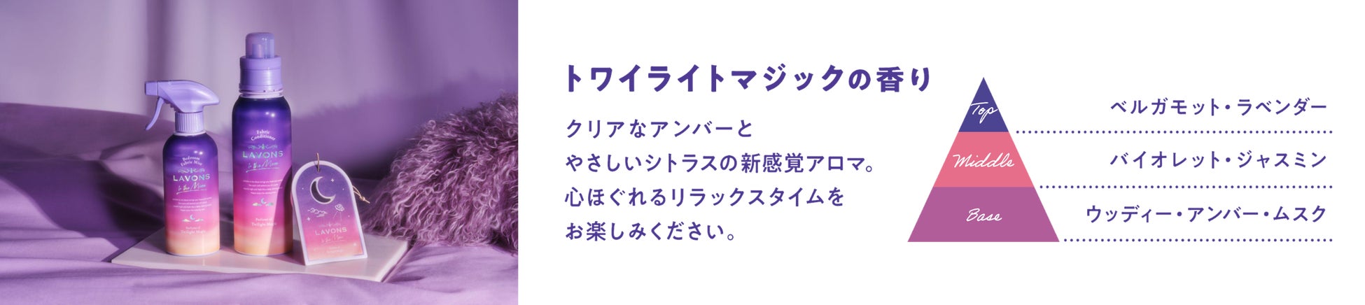 就寝前だけでなく、疲れを感じたとき、ちょっと一息つきたい、穏やかな気持ちになりたいときなど、ぜひこのベッドルーム&ファブリックミストのトワイライトマジックの香りに包まれながら、癒されるひと時をお過ごしください。