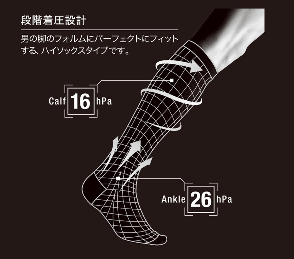 「シェイパーズ フォーメン」は、「脚を入れた瞬間、全身が引き締まる。そして脱いだときにその真価が分かる。」のキャッチコピーで2005年にデビューした着圧機能のある男性向けビジネスソックスです。日本市場においてほとんど浸透されていないロングホーズ(ハイソックス)である上、締め付けられるのが苦手とされている男性に向けた着圧ソックスであるといった従来の常識を覆した男性向けソックスであるにもかかわらず、おしゃれ好きなビジネスマンを中心に話題となり、瞬く間に当社を代表するブランドのひとつとなりました。その「シェイパーズ フォーメン」の最大のヒット理由は、当社が独自に導き出した最適な着圧値と仕様にあります。ふくらはぎには16hPa(ヘクトパスカル)*、足首には26hPaの着圧をかけ、また、つま先部は指が解放できるよう圧迫が少ない形状にすることで、脚を快適で爽快な心地へと誘うだけでなく、すっきりとした美しい足もとを演出すると、2005年度のグッドデザイン賞を受賞しました。