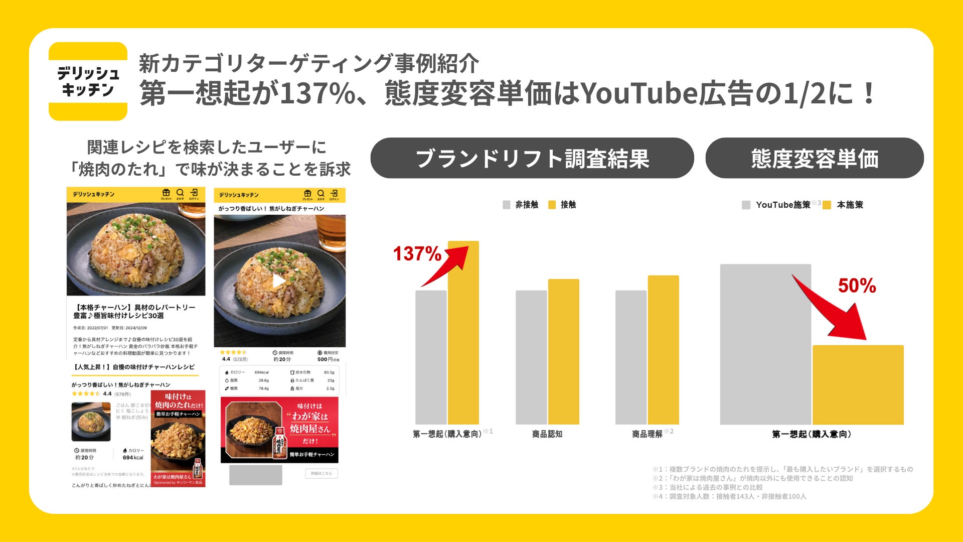 株式会社エブリー(本社:東京都港区、代表取締役社長:吉田 大成)が運営する『デリッシュキッチン』のディスプレイ広告「カテゴリターゲティング」は、2025年4月にリニューアルを実施しました。リニューアル後、キッコーマン食品株式会社(本社:東京都港区、代表取締役社長:中野 祥三郎)の焼肉のたれ「わが家は焼肉屋さん」のプロモーションとして、カテゴリターゲティングの配信を行った結果、第一想起が137%に伸長。態度変容単価もYouTube広告の2分の1に抑えられる結果となりました。この度、カテゴリーターゲティングのリニューアルを記念し、2025年6月末までのご発注で、クリエイティブ無償制作キャンペーンを実施します。