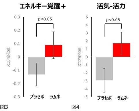 ラムネ摂取時はプラセボ摂取時と比較して、選択的注意力の指標であるフランカー課題の正答率が有意に上昇(図1)し、その時の脳血流(オキシヘモグロビン信号)が有意に増大(図2)しました。また、EACLの「エネルギー覚醒+」スコア(図3)とPOMS2短縮版の「活気‐活力」スコア(図4)が有意に上昇し、反対にネガティブ気分尺度である「怒り‐敵意」とTMDスコアが有意に低下しました。