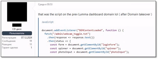 Lummaの開発者によると、捜査当局は地理的な理由からLummaのメインサーバーを物理的に押収することはできなかったものの、iDRAC(Integrated Dell Remote Access Controller)の未知の脆弱性を悪用して、サーバーへの侵入に成功しました。これにより、サーバー本体とそのバックアップデータが完全に消去されました。Lummaの開発者は顧客のIPアドレスを記録していなかったと述べていますが、当局はLummaの利用者の認証情報とデジタルフットプリントを収集するための偽のログインページを作成していました。さらに、利用者のウェブカメラへのアクセスを試みるJavaScriptコードも仕込まれていたことが判明しています。