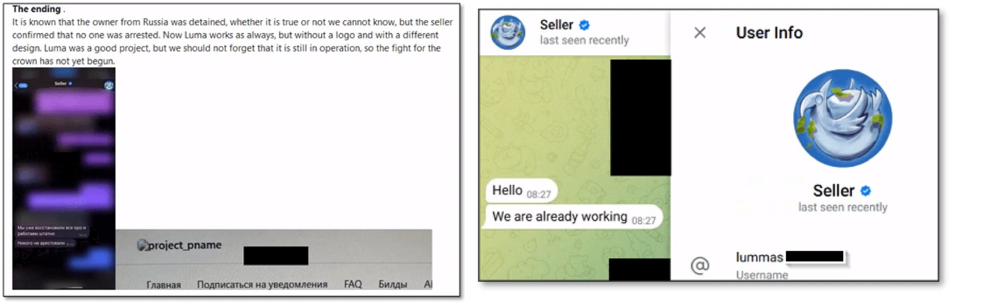 Lummaの開発者たちは、すでに運営を再開したと主張しています。複数のサイバー犯罪者たちがテレグラム上のやりとりを公開しており、開発者は、Lummaの関係者は逮捕者は出ておらず、「すべてが復旧し、通常通り稼働している」と述べているとのことです。