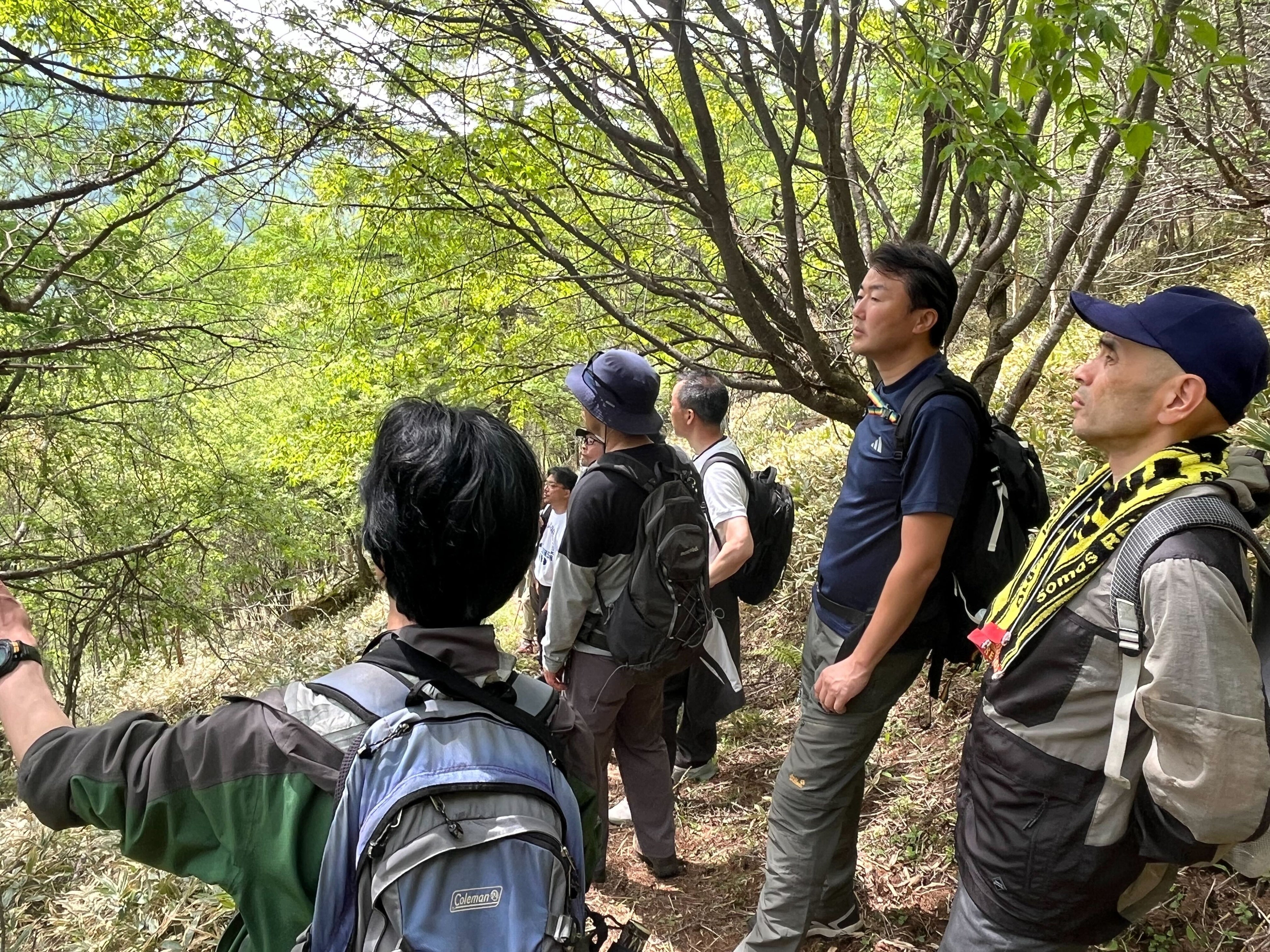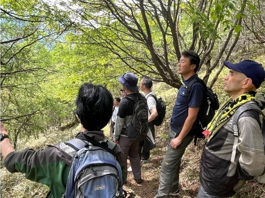 生物多様性の保全に取り組むためには、直接自然環境に触れながら植物や生態系等について理解を深めることも重要と考えています。このような背景から、「アスクル・嬬恋銘水の森」での植樹後、アスクルと嬬恋銘水の社員は、浅間山北麓ジオパーク(※2)による自然体験プログラム「森の多面的機能を知ろう」に参加し、地蔵峠・せんべい平・小桟敷山を約3時間トレッキングしました。トレッキングでは、水源の山に残る天然カラマツ林が保全されている様子の視察のほか、渡り蝶の一種のアサギマダラの飛来地の“せんべい平”で自然環境を観察する等、多方面から嬬恋村の植物や生態系について学び、生物多様性について理解を深めることができました。