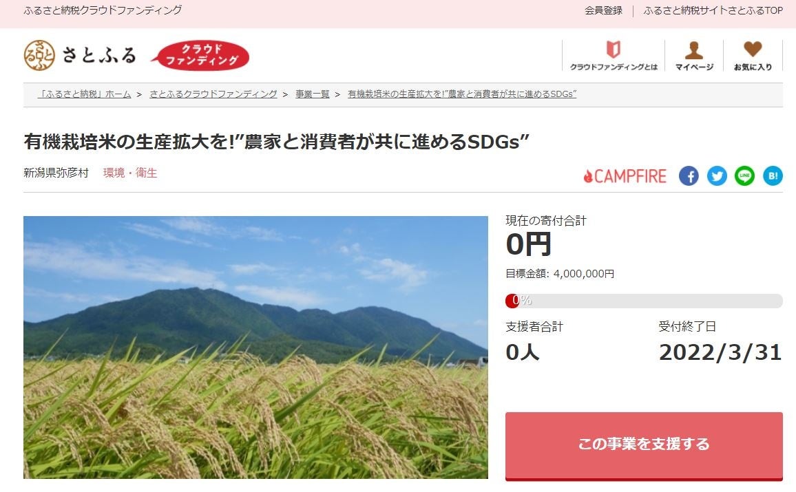 新潟県弥彦村とふるさと納税ポータルサイト「さとふる」(https://www.satofull.jp/)を運営する株式会社さとふる(本社:東京都中央区、代表取締役社長:藤井 宏明)は、寄付金の使途に応じて事業を立ち上げ寄付を募る「さとふるクラウドファンディング」(https://www.satofull.jp/projects/top.php)にて、弥彦村で20年以上続く有機栽培米の生産拡大を通じて、地域の豊かな自然環境を子どもたちへ遺すため、2022年1月12日より寄付受け付けを開始します。