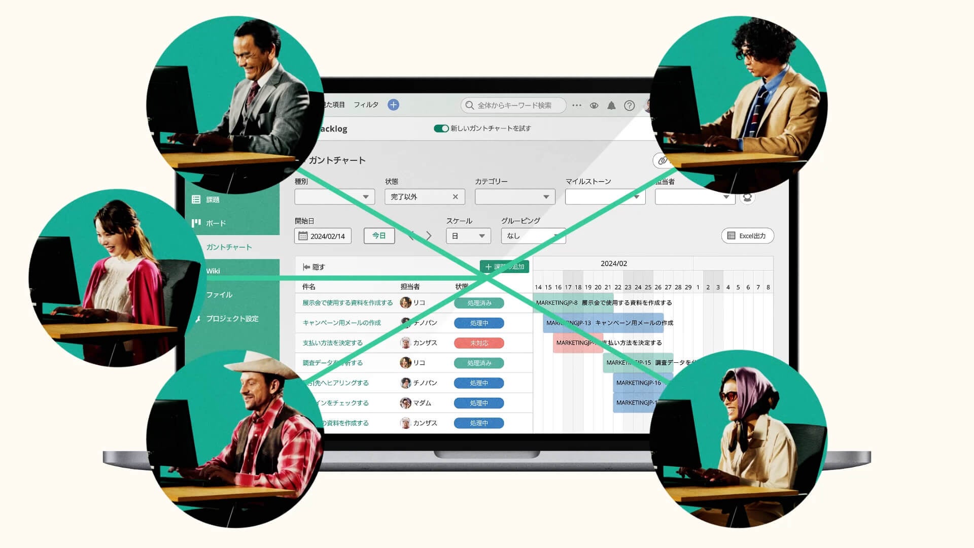 これまではバラバラだったプロジェクトに関する情報をBacklogで一括管理することで、スムーズにチームで情報共有が可能になり、コラボレーションが促進されていく様子がわかります。得意分野が異なるメンバーも、Backlogを通じてそれぞれの強みを活かして働けることを表現しています。