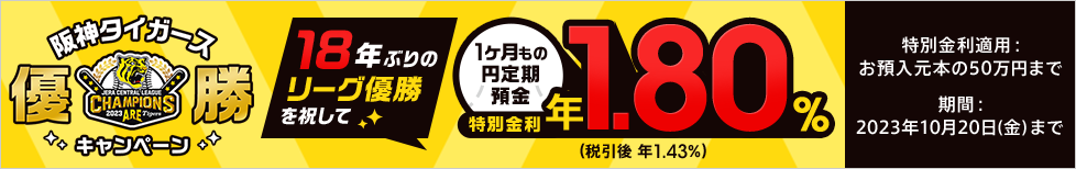 本キャンペーンでは、2023年9月15日から10月20日までの実施期間中に、預入期間1カ月の円定期預金(1カ月もの円定期預金)を新規にお預け入れいただくと、金利が通常年0.03%(税引後 年0.023%)のところ、“18年ぶり”の優勝にかけて年1.8%(税引後 年1.43%)*の特別金利を適用します。