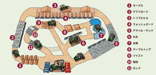 | 体験セクション | 1.デブリロード→2.ウォッシュボード→3.グラベル・サンド→ 4.デブリロード→5.トリプルヒル→6.グラベル・サンド→7.丸太→ 8.水路→9.モーグル→以降1から順に繰り返し |