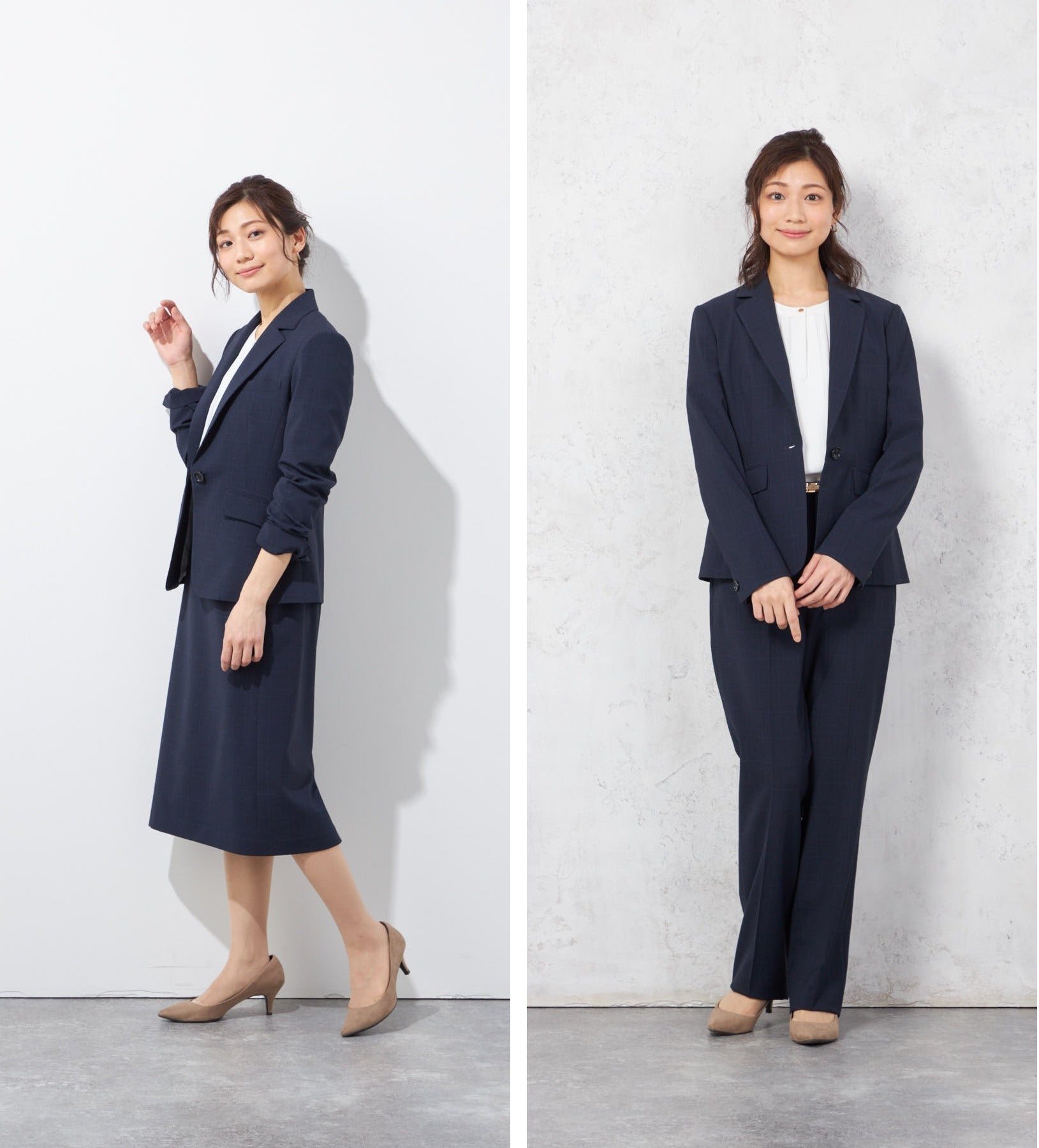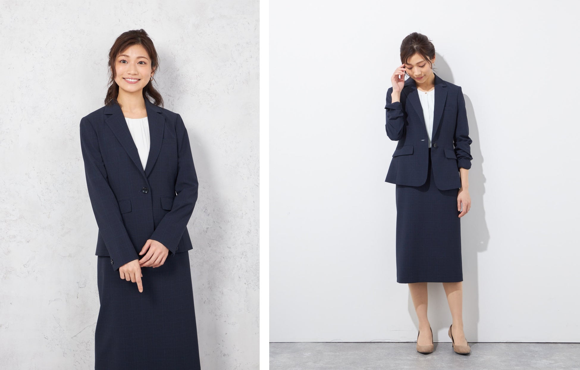 このたび展開を開始する「合繊ネービーチェックセットアップ」は、『ストレッチ・ウォッシャブル・UVカット』と夏場のビジネスウェアにあると嬉しい機能性を追求したセットアップです。ベーシックなネービーのチェック柄に、ボトムは大人なスタイルが叶うストレートパンツ、膝が隠れる長めの丈感で上品な印象のタイトスカートの2種のボトムでご用意しました。UVカット機能で夏場の着用が安心、上下ウォッシャブルで汗をかく季節も自宅で簡単ケアが可能でいつでも清潔にご着用いただけます。