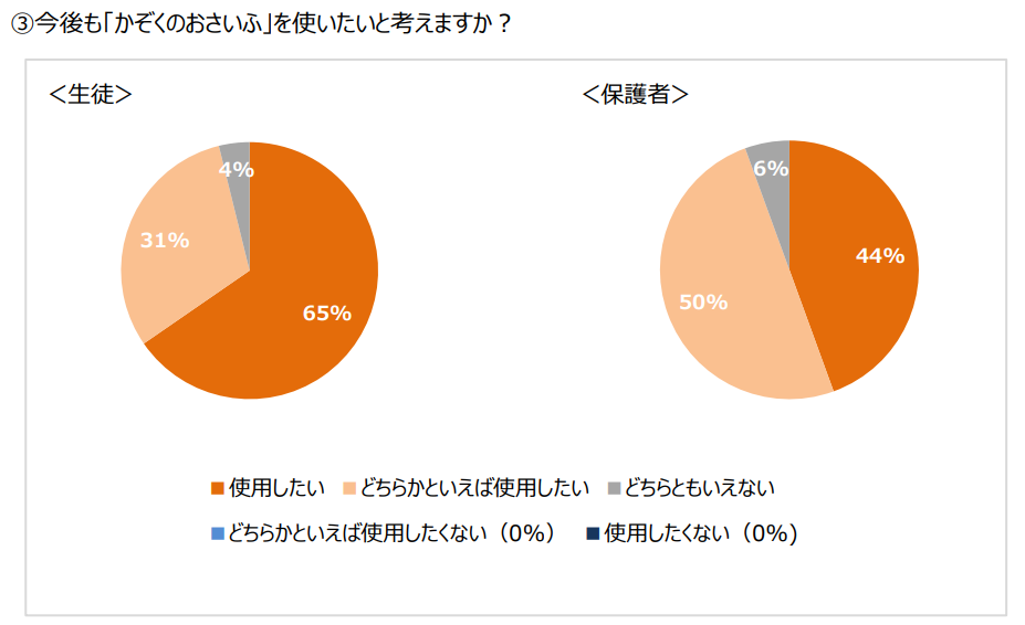 今回の研修旅行で、実際に「かぞくのおさいふ」をご使用いただいた生徒および保護者に、アンケートを実施しました。主なアンケート項目とご回答いただいた内容を、以下の通り掲載させていただきます。