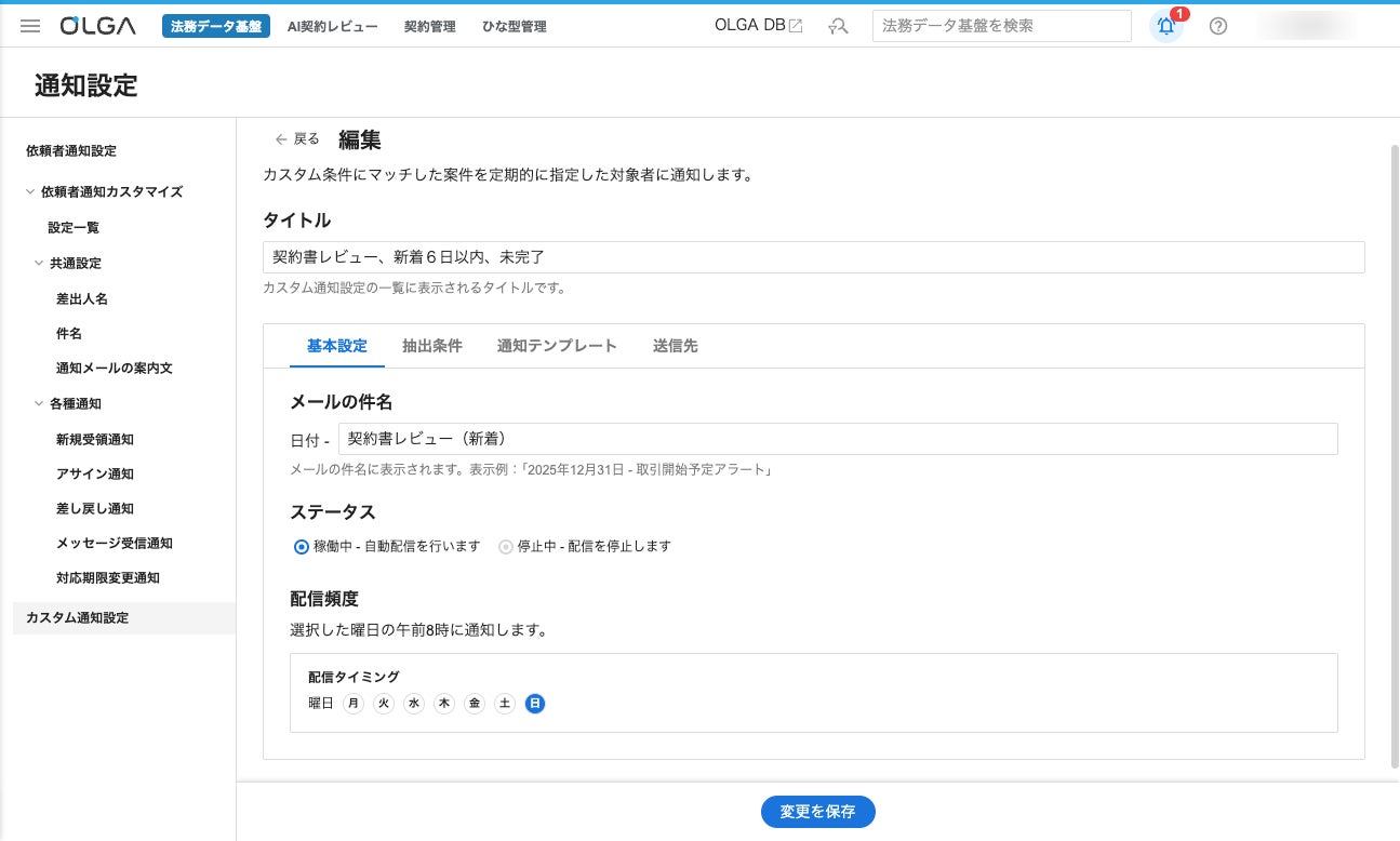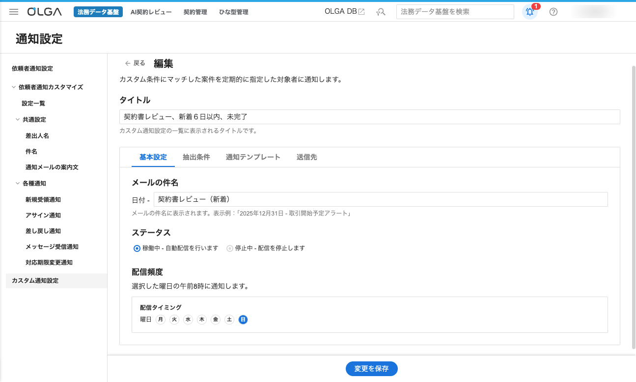 例えば、「ステータスが未完了で、希望納期が7日以内の案件を、毎日法務担当者へ通知」といった納期リマインダー設定も可能です。
