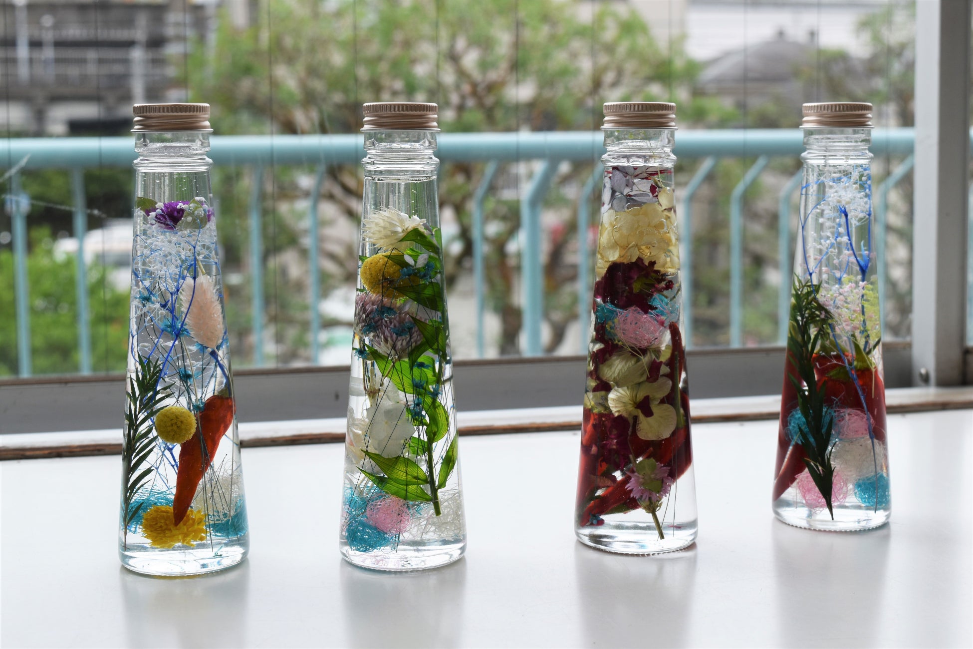 ※ハーバリウム(Herbarium)とは「植物標本」を意味し、研究のために植物を乾燥させた標本の集積をさします。現在は観賞目的で制作したガラス瓶でオイルに漬けたのものもハーバリウムとよばれています。