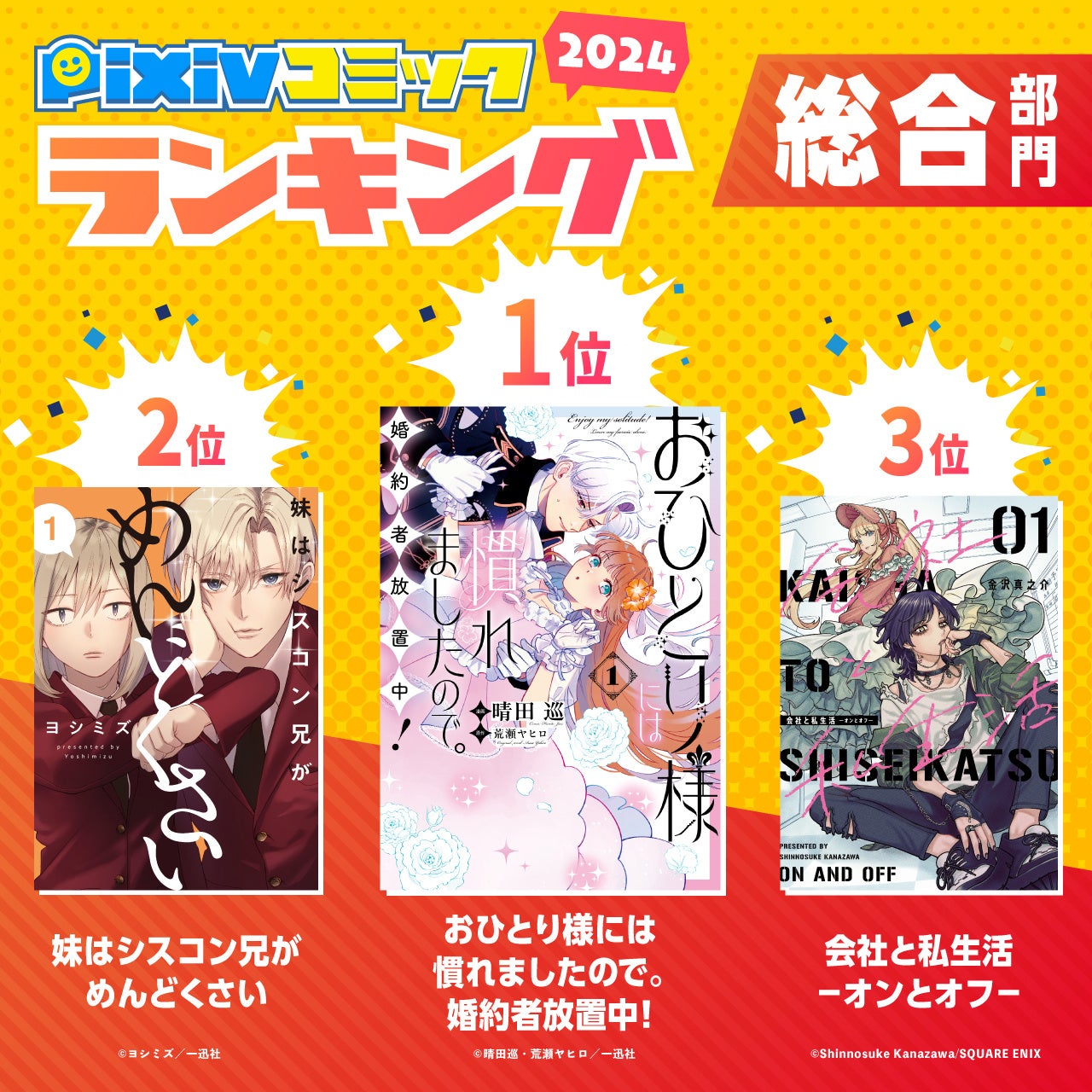 2024年にpixivコミックで読者から人気を集めた作品を、総合部門と、pixivコミックで人気が高いカテゴリである「恋愛」「ギャグ・コメディ」「日常・ヒューマンドラマ」「BL」「ファンタジー」「動物」の6部門に分け、各部門のトップ3を発表します。