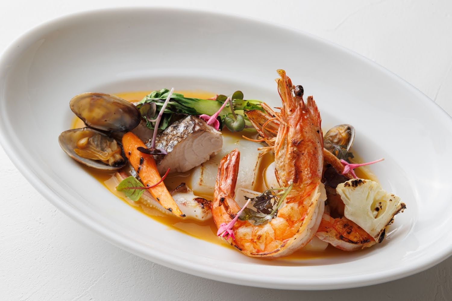 瀬戸内産の魚介を贅沢に使用した、風味豊かなブイヤベース仕立て。魚介の旨みが凝縮された熱々のスープを目の前で注ぎます。瀬戸内の海や風味豊かな魚介の香りをお楽しみいただけます。