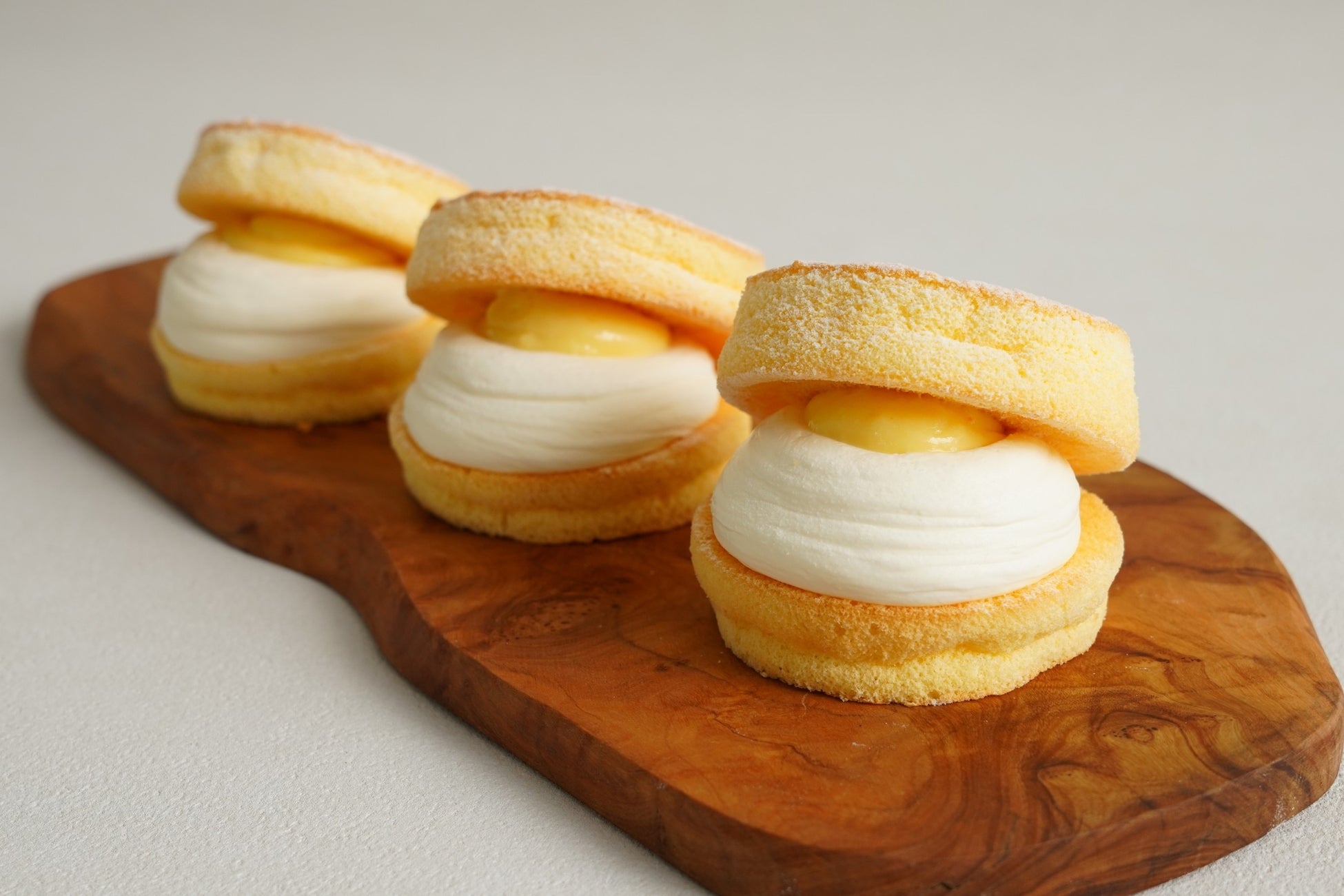 パティシエが丁寧に焼き上げたふわふわのパンケーキで、コクと風味豊かなホイップクリームに淡路島の藻塩をプラス。表面には2種類の焼印が入るワンハンドスイーツ。