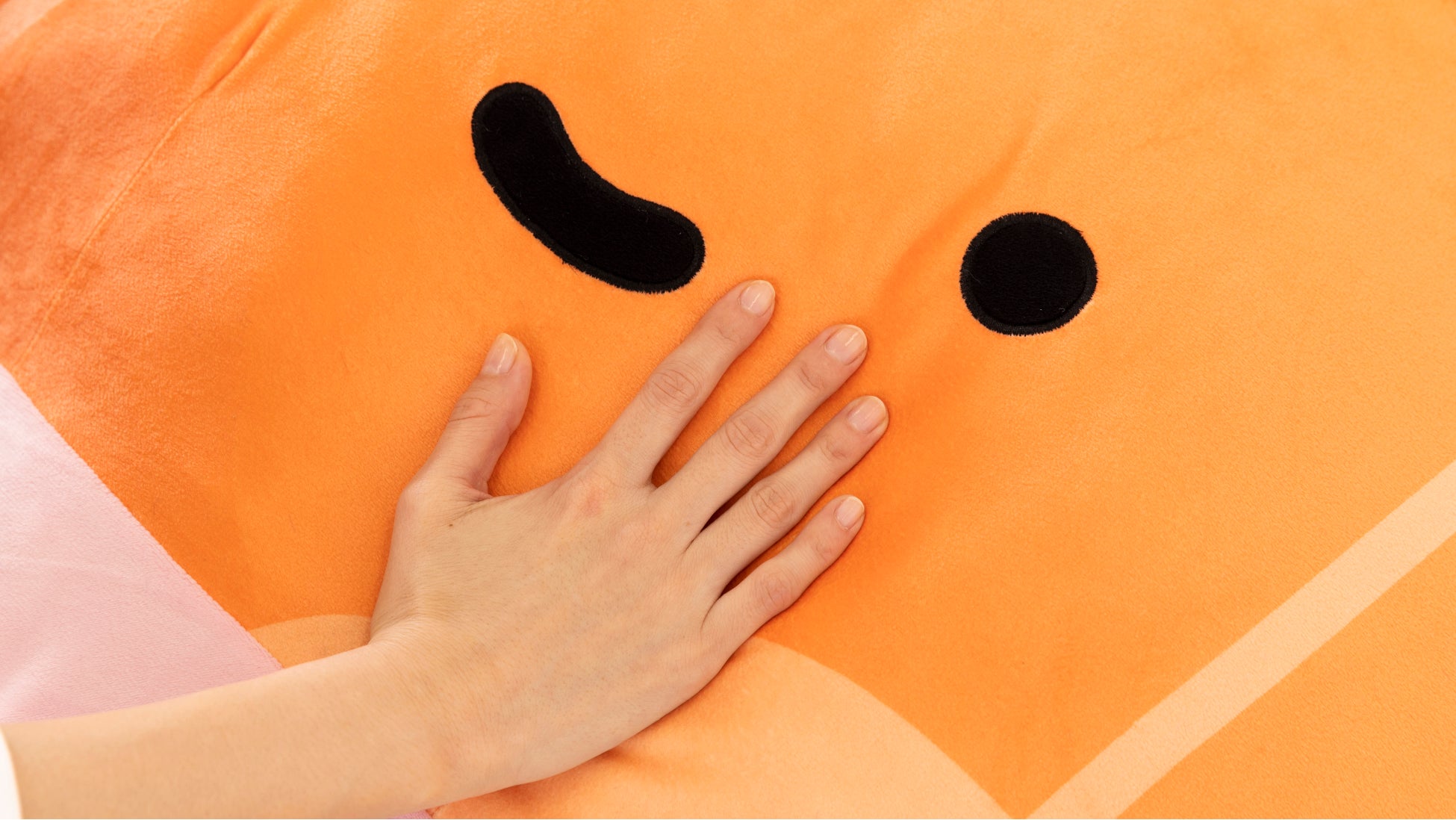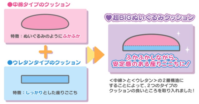 今回販売するBIGぬいぐるみクッションは、いつまでも触っていたくなるような手触りを追求。キャラクターのイメージにあわせた生地を採用しています。また、内部はふかふかの中綿と、ウレタンをあわせた2層にすることで、安定感がある構造を実現しました。