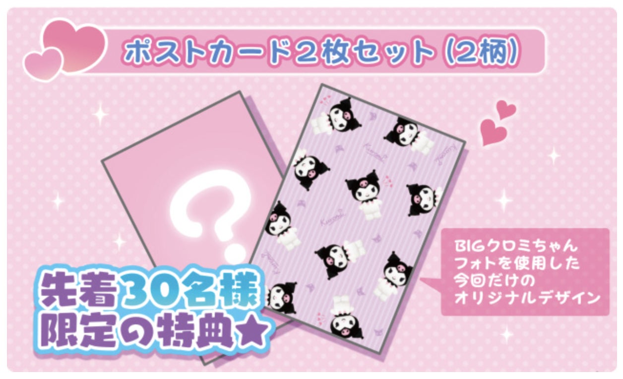 プロジェクトが達成した際、先着購入した30名様限定の特典として、ポストカード2枚セット(2柄)をご用意しています。BIGぬいぐるみクッションを使用した今回だけのオリジナルデザインです。