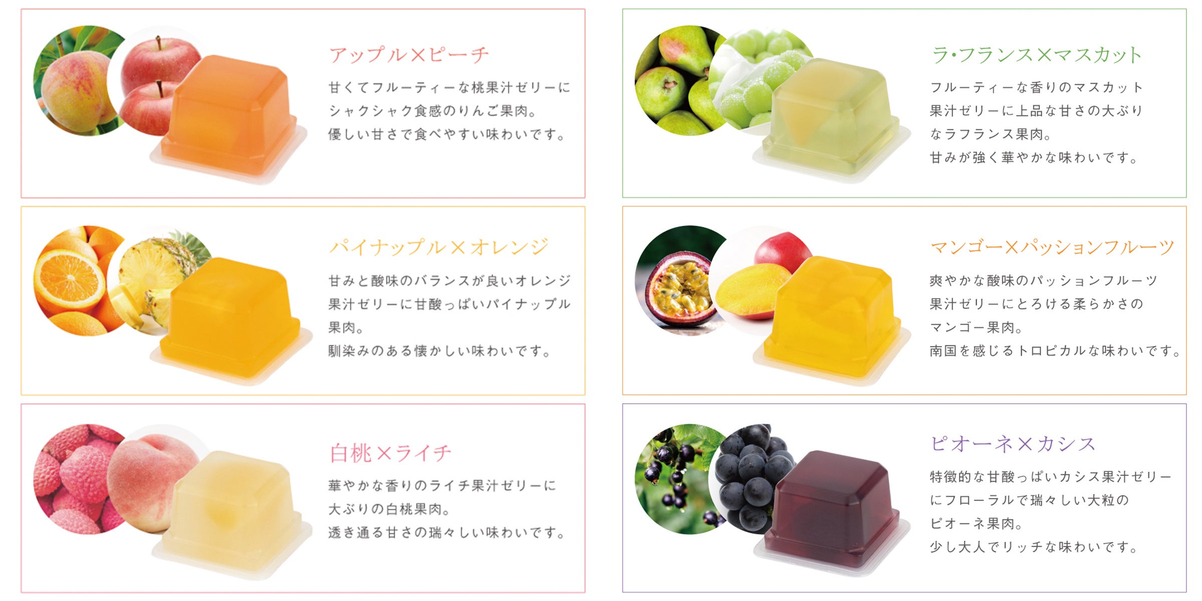 白桃&ライチ、ピオーネ&カシス、パイナップル&オレンジ、マンゴー&パッションフルーツ、ラフランス&マスカット、りんご&ピーチの6種類のフレーバーがあり、それぞれ異なるフルーツの果肉と果汁を組み合わせています。