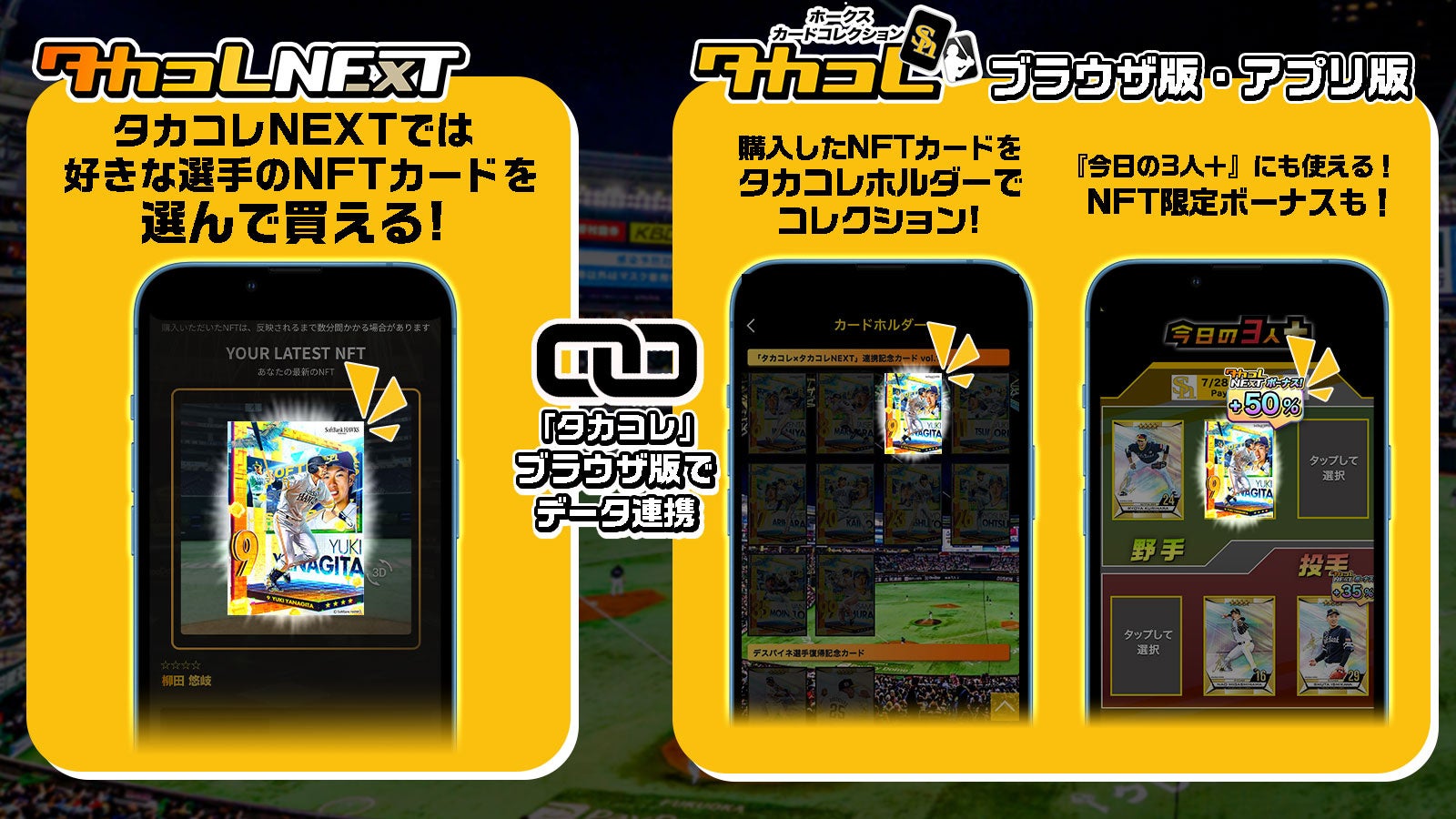 また、オリジナルNFTサービス「タカコレNEXT」との連携を開始いたしました。これにより「タカコレNEXT」で購入したNFTカードを「タカコレ」のカードホルダーでコレクションできたり、試合で活躍する選手を予想してスコアを獲得し楽しめるコンテンツ『今日の3人+』にも設定できたり、お気に入りの選手を設定し自分だけのオリジナルチームが作れる機能「マイチーム」に設定できるなど、NFTの楽しみ方が広がります。