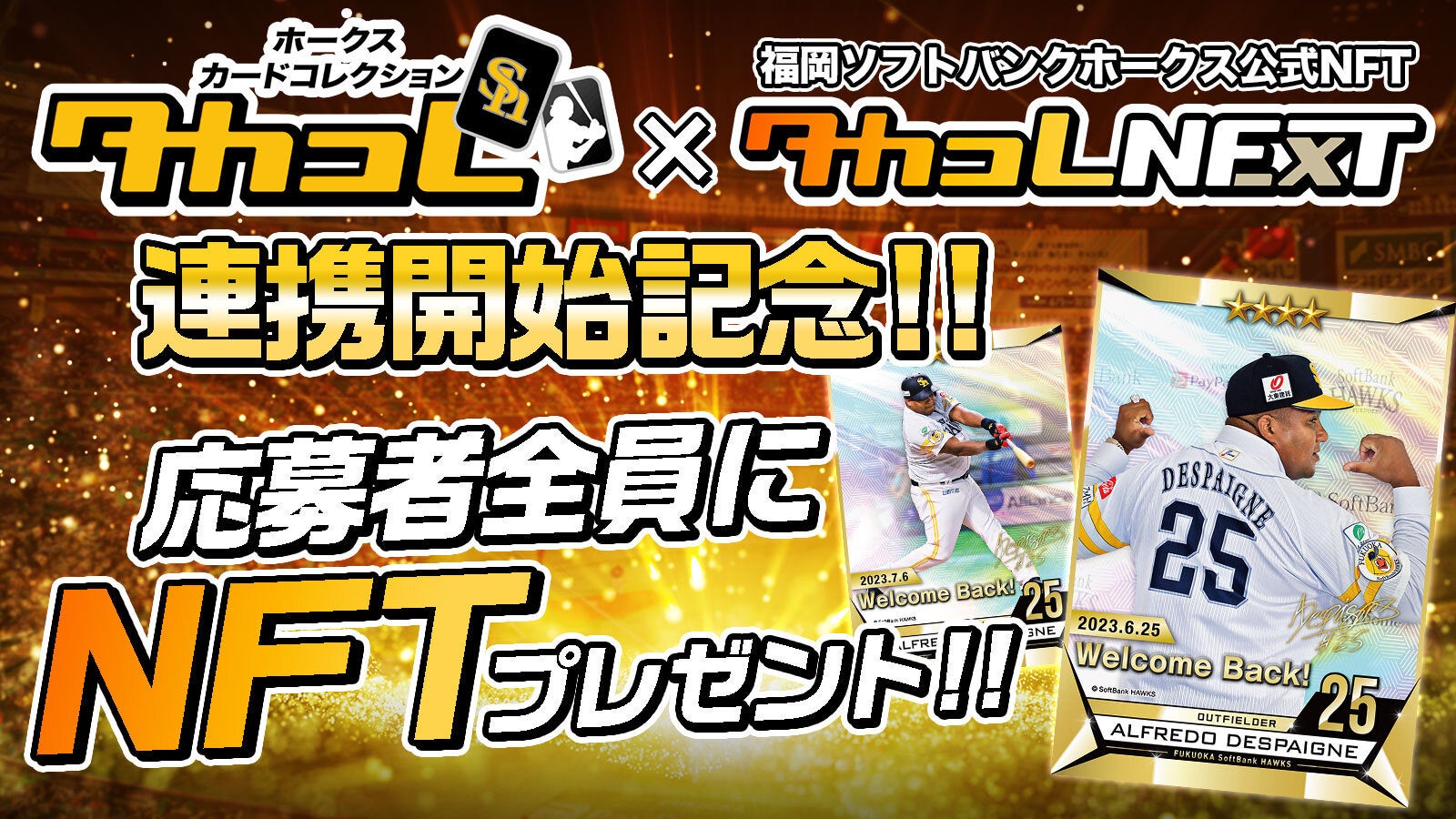 「タカコレ」と「タカコレNEXT」の連携を記念して、「デスパイネ選手復帰記念NFTカード」をプレゼント!「タカコレNEXT」への登録と「タカコレ」の連携で最大2枚のNFTを手に入れる事ができます。
