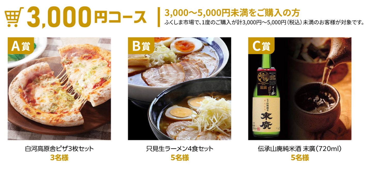 ふくしま市場で、キャンペーン期間中に一度のご購入が計3,000円/5,000円/10,000円以上の方に、当店よりお送りする該当コースの応募フォームからご応募ください。