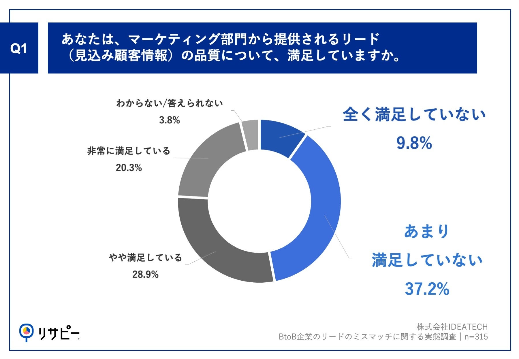 「Q1.あなたは、マーケティング部門から提供されるリード(見込み顧客情報)の品質について、満足していますか。」(n=315)と質問したところ、「全く満足していない」が9.8%、「あまり満足していない」が37.2%という回答となりました。