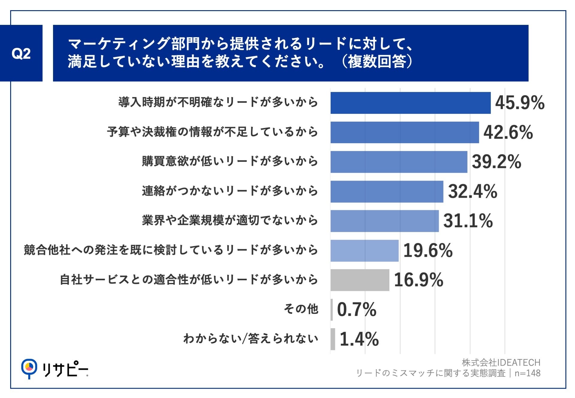 Q1で「あまり満足していない」「全く満足していない」と回答した方に、「Q2.マーケティング部門から提供されるリードに対して、満足していない理由を教えてください。(複数回答)」(n=148)と質問したところ、「導入時期が不明確なリードが多いから」が45.9%、「予算や決裁権の情報が不足しているから」が42.6%、「購買意欲が低いリードが多いから」が39.2%という回答となりました。